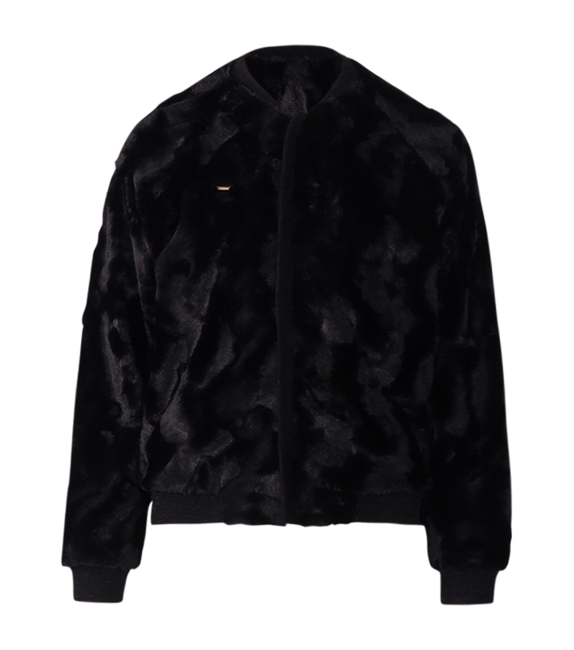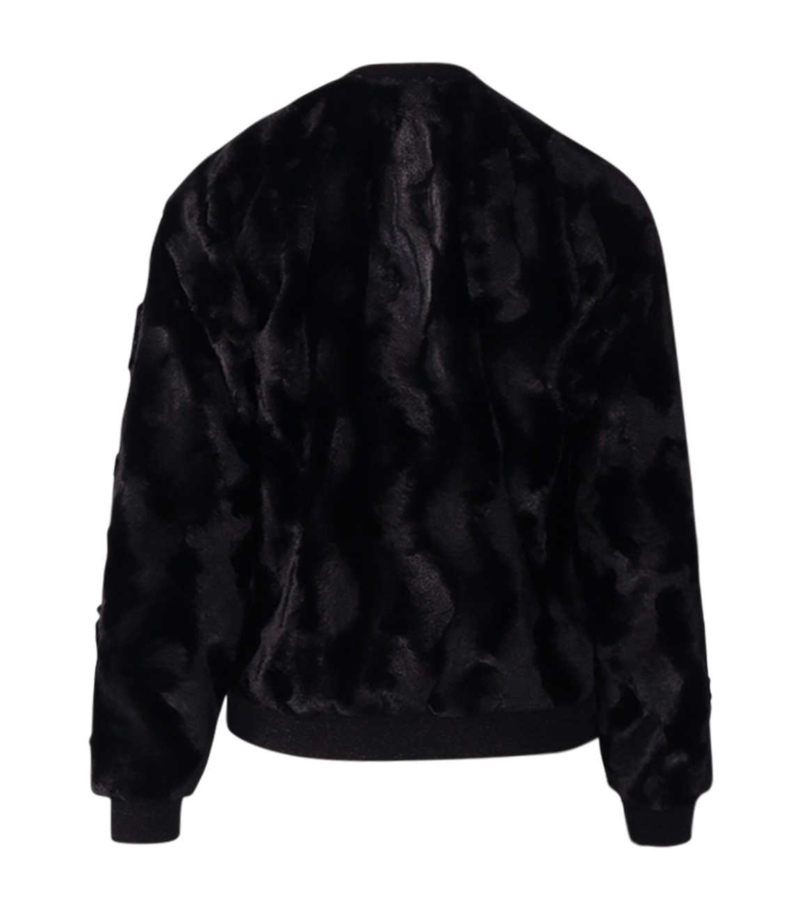 ZIP73 bomber jacket W25/440/02/001. Dit wijdvallend model is voorzien van een ronde hals en heeft lange mouwen. Deze faux fur zwarte bomber jacket sluit door middel van een rits en is afgewerkt met glitter boorden.
