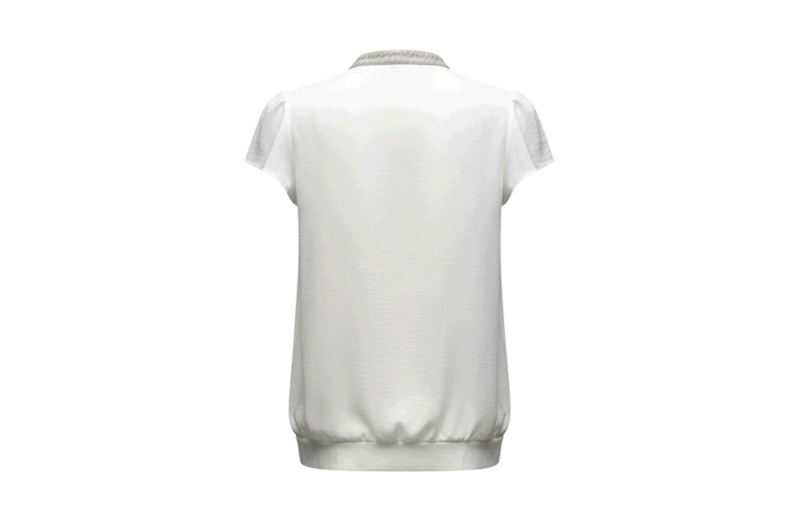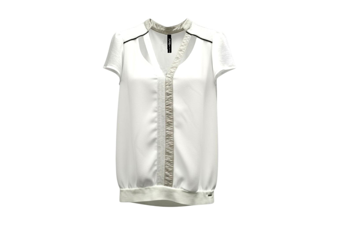 ZIP73 Top Cut-out Off-white 111-Offwhite. Dit rechtvallend model is voorzien van een ronde hals met v-inkeping bewerkt met fake leather en heeft korte mouwen. Deze off-white kleurige top van ZIP73 is aan de voorzijde bewerkt met een glitter bies en is aan de onderzijde afgewerkt met een elastische boord.