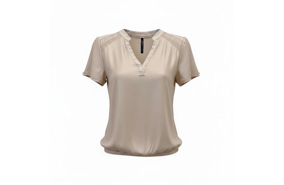 ZIP73 Top Leahter V Sparkling Sand 190-Sand. Dit soepelvallend model heeft een v-hals en korte mouwen. Deze beige glitter top van Zip73 is bewerkt met verschillende leather-look biesjes en voorzien van een elastische boord aan de onderzijde.