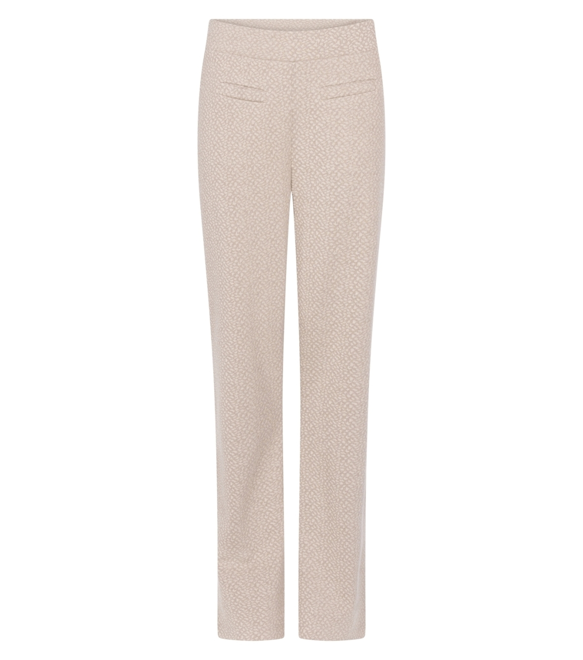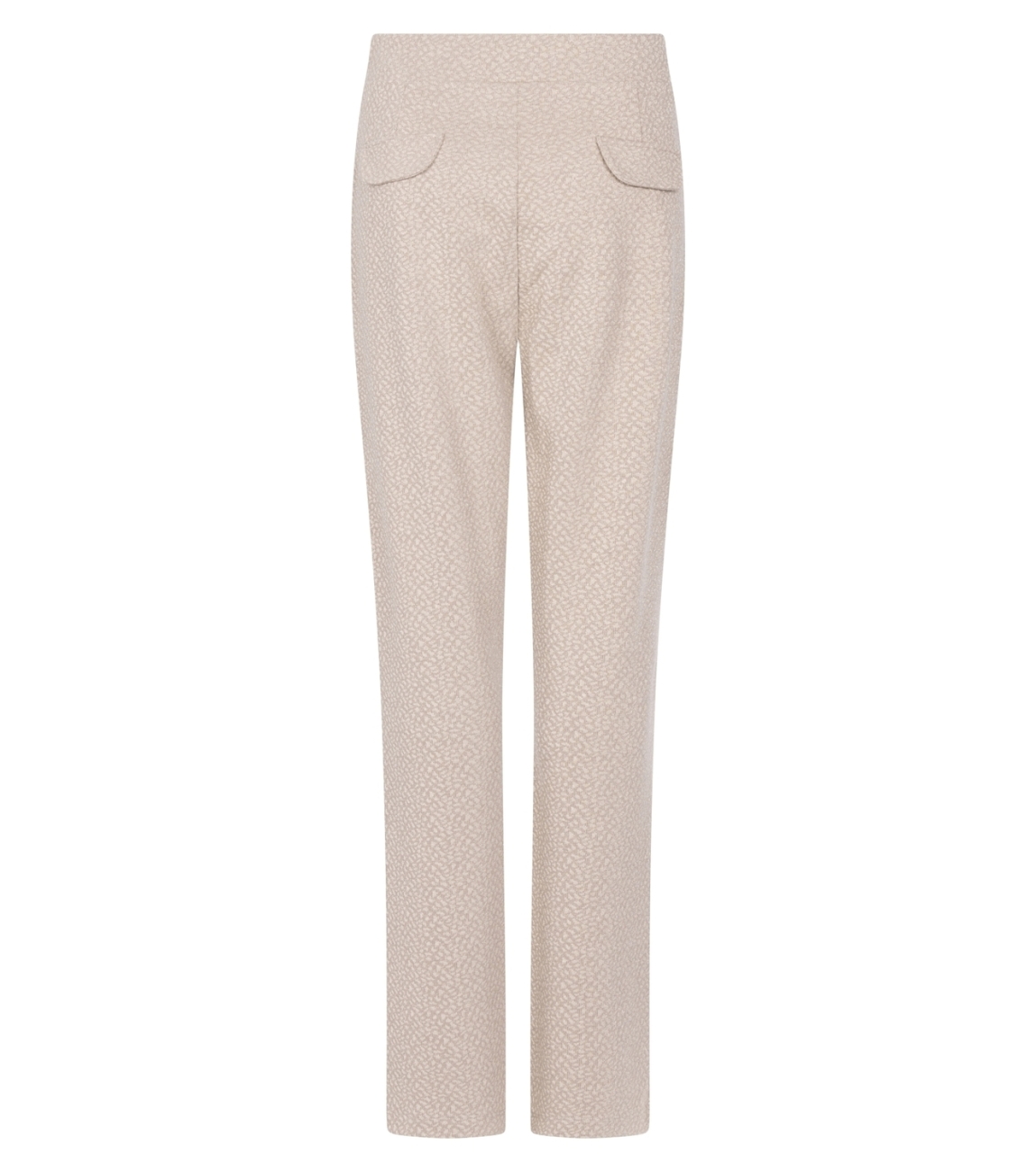Zoso broek 254Alice. Dit flared fit model sluit door middel van een elastische boord. Deze bruine Zoso broek is bewerkt met een grafisch glitter patroon. Dit model beschikt over twee paspelzakken aan de voorzijde en twee decoratieve klepzakken aan de achterzijde.
