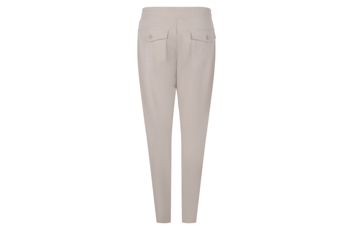 Zoso broek Amber. Dit aangesloten model sluit door middel van een elastische boord met trekkoorden. Deze zandkleurige broek van Zoso is voorzien van twee steekzakken aan de voorzijde en twee klepzakken aan de achterzijde met knoop.