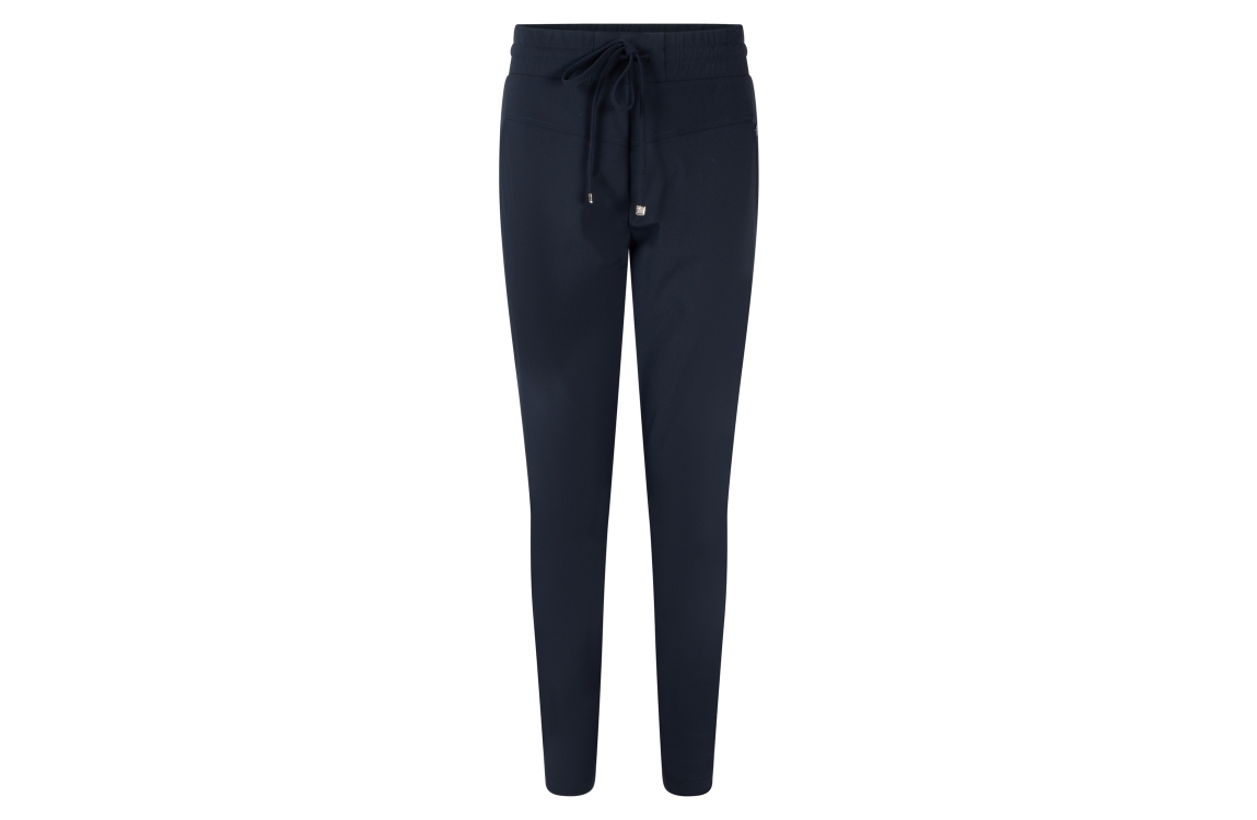 Zoso broek Amber. Dit aangesloten model sluit door middel van een elastische boord met trekkoorden. Deze navy kleurige broek van Zoso is voorzien van twee steekzakken aan de voorzijde en twee klepzakken met knoop aan de achterzijde.