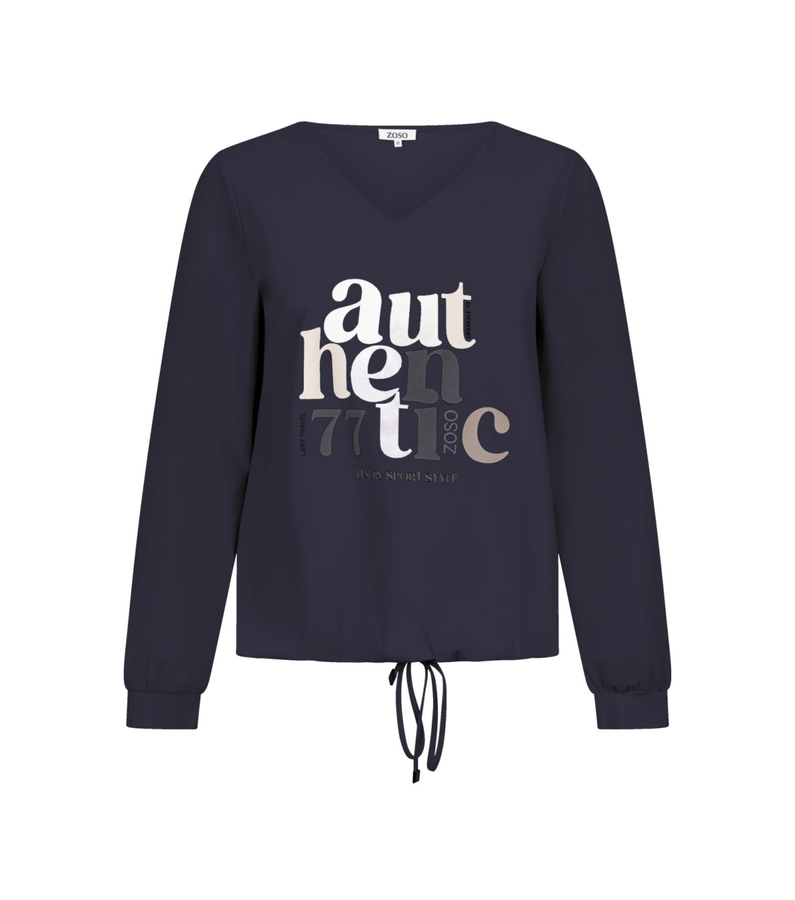 Zoso shirt Audrey. Dit rechtvallend model is voorzien van een v-hals en heeft lange mouwen. Deze donkerblauwe shirt van Zoso is bewerkt met een tekstopdruk en is afgewerkt met trekkoorden aan de onderzijde.