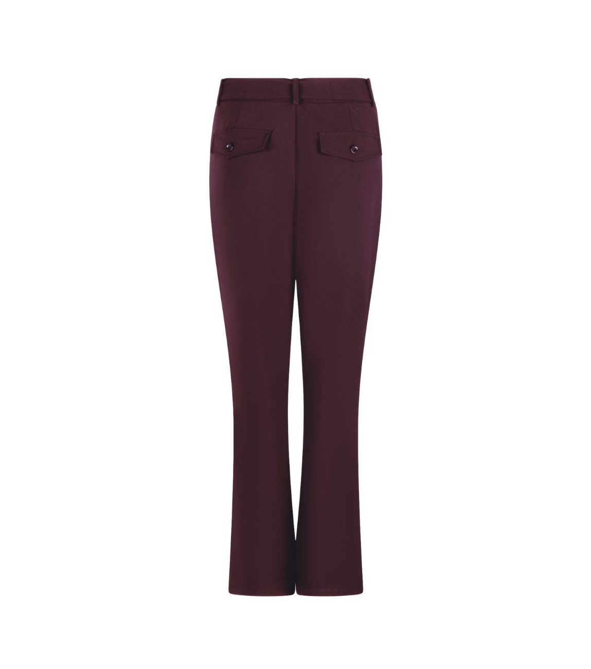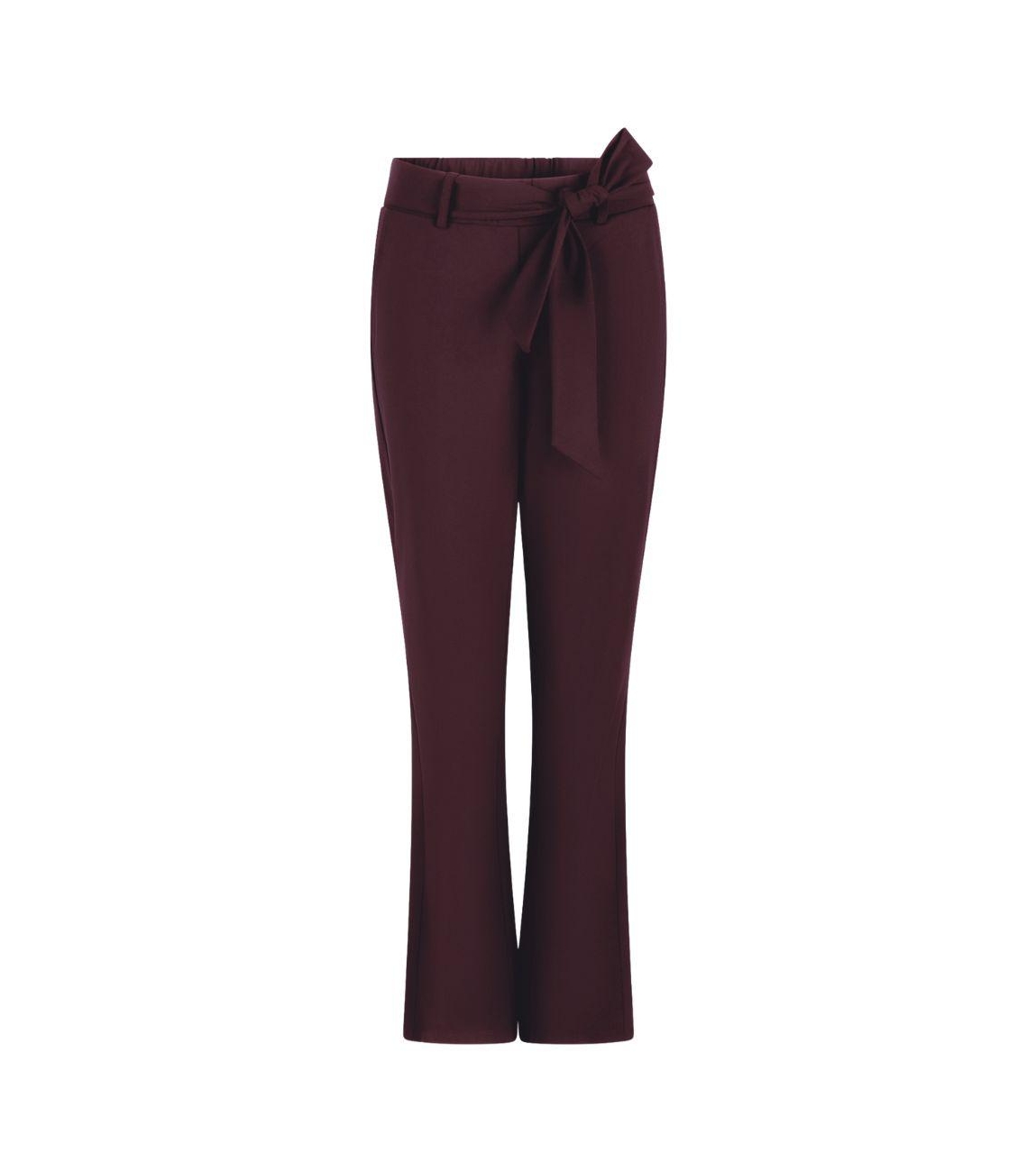 Zoso broek Belle. Dit flared fit sluit door middel van een elastische boord met een afneembaar ceintuur. Deze bordeaux kleurige broek van Zoso is voorzien van twee steekzakken aan de voorzijde en twee klepzakken aan de achterzijde.