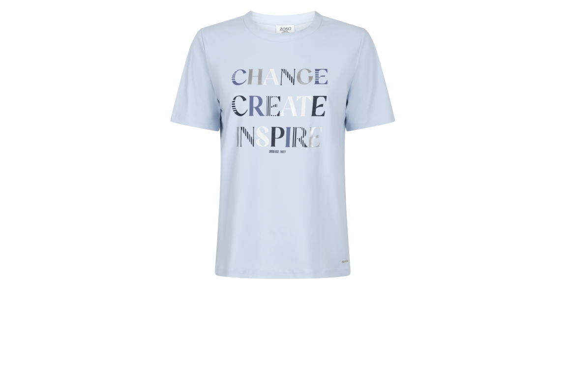 Zoso T-shirt Claire. Dit rechtvallend model is voorzien van een ronde hals en heeft korte mouwen. Deze lichtblauwe T-shirt van Zoso is bewerkt met een subtiele tekstopdruk.