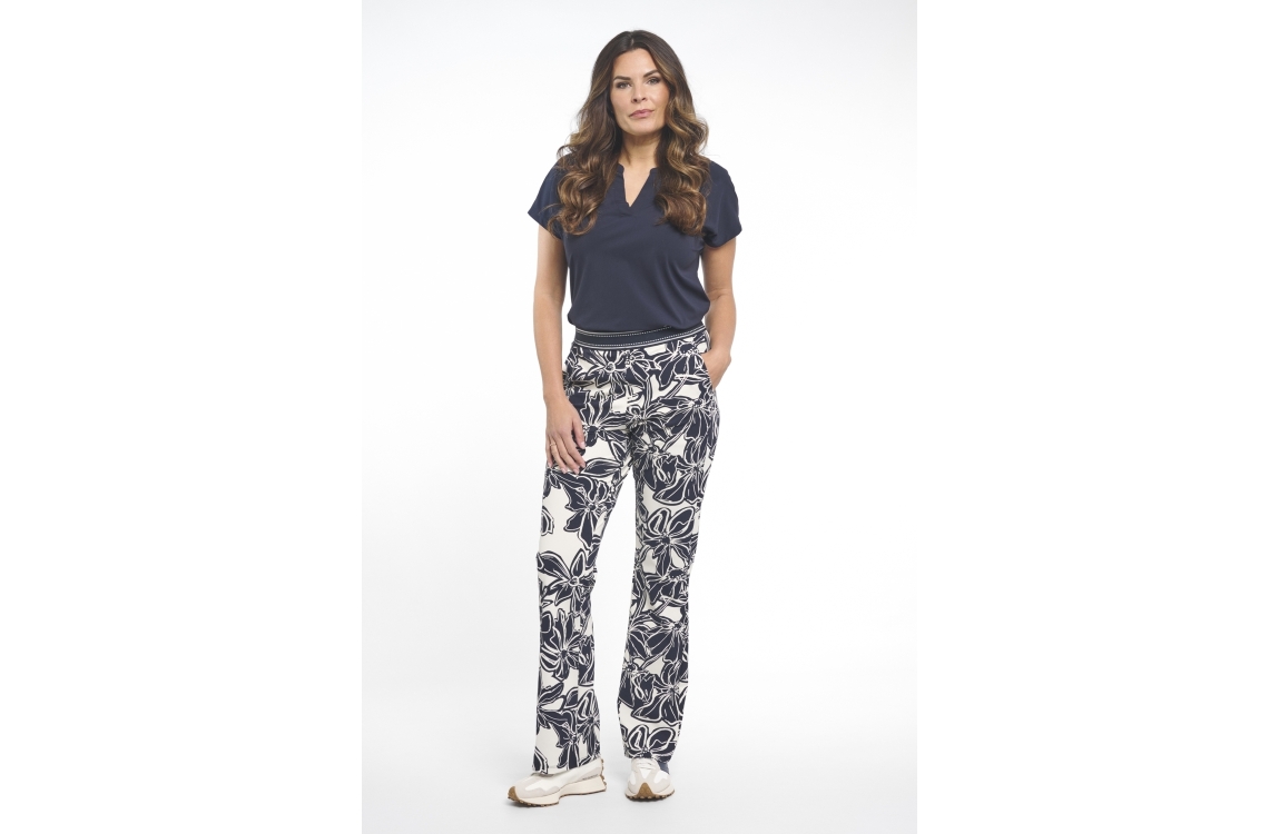 Zoso broek Devon. Dit aflared model sluit door middel van een elastische boord afgewerkt met witte accenten. Deze donkerblauwe broek van Zoso is voorzien van twee steekzakken aan de voorzijde en twee klepzakken aan de achterzijde. Dit model is afgewerkt met een bloemenprint all-over.