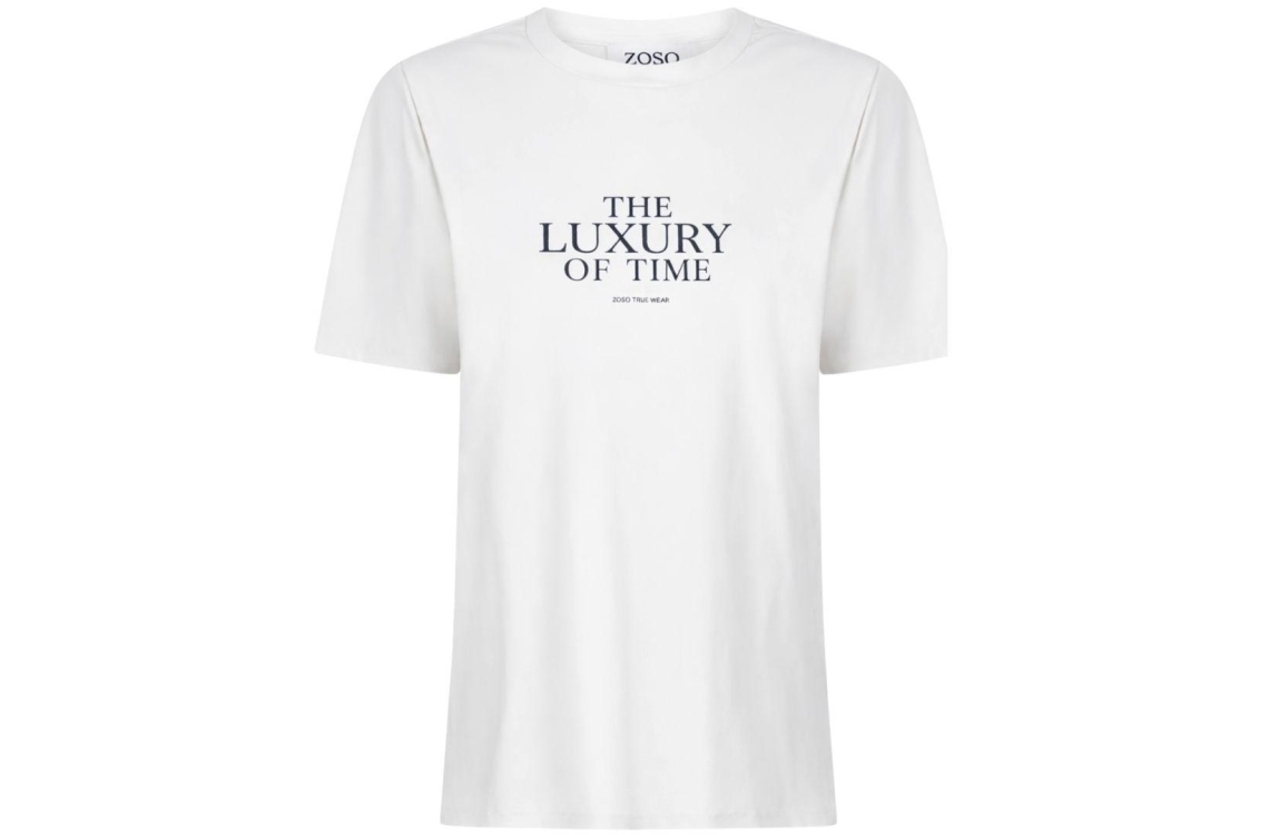 Zoso T-shirt Isabel. Dit rechtvallend donkerblauwe model is voorzien van een ronde hals en heeft korte mouwen. Dit witte T-shirt van Zoso is bewerkt met een subtiele donkerblauwe tekstopdruk.