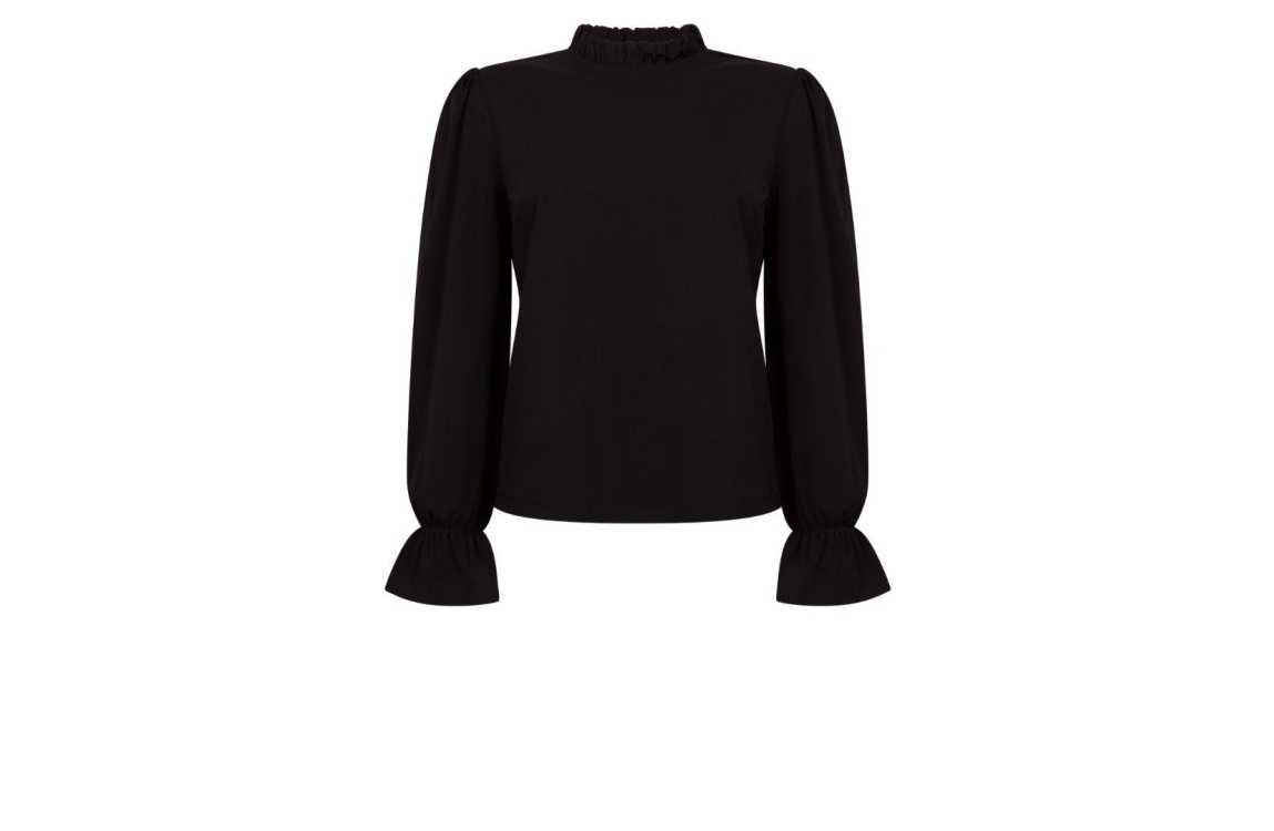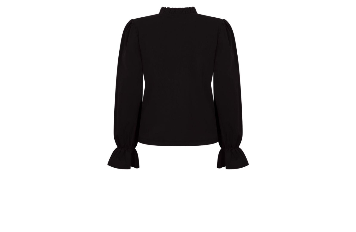 Zoso blouse Jeyda. Dit zwarte rechtvallend model is voorzien van een ronde hals en heeft lange mouwen afgewerkt met ruches.