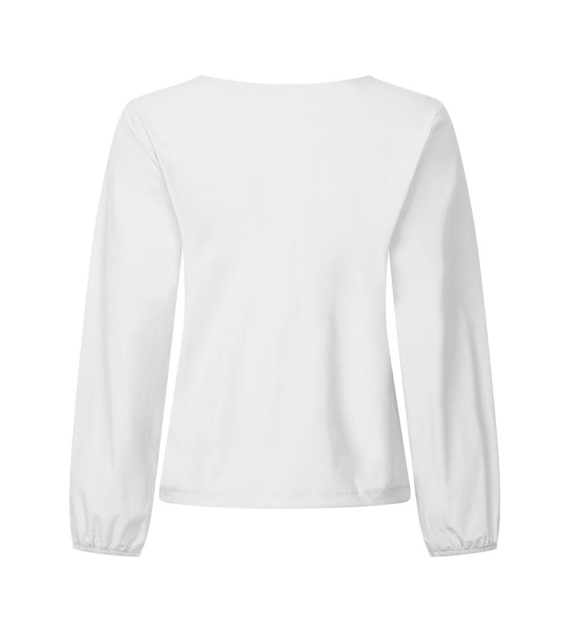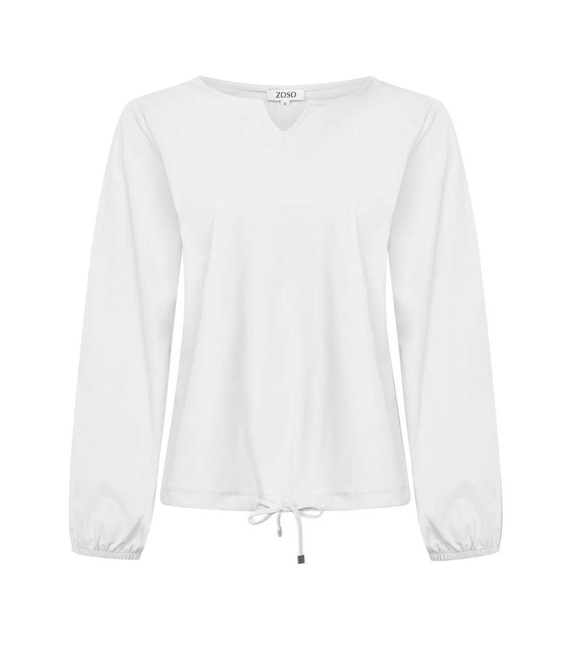 Zoso top Joan. Dit rechtvallend model is voorzien van een ronde hals met v-inkeping en heeft lange mouwen afgewerkt met elastische boorden. Deze witte top van Zoso beschikt over trekkoorden aan de onderzijde.