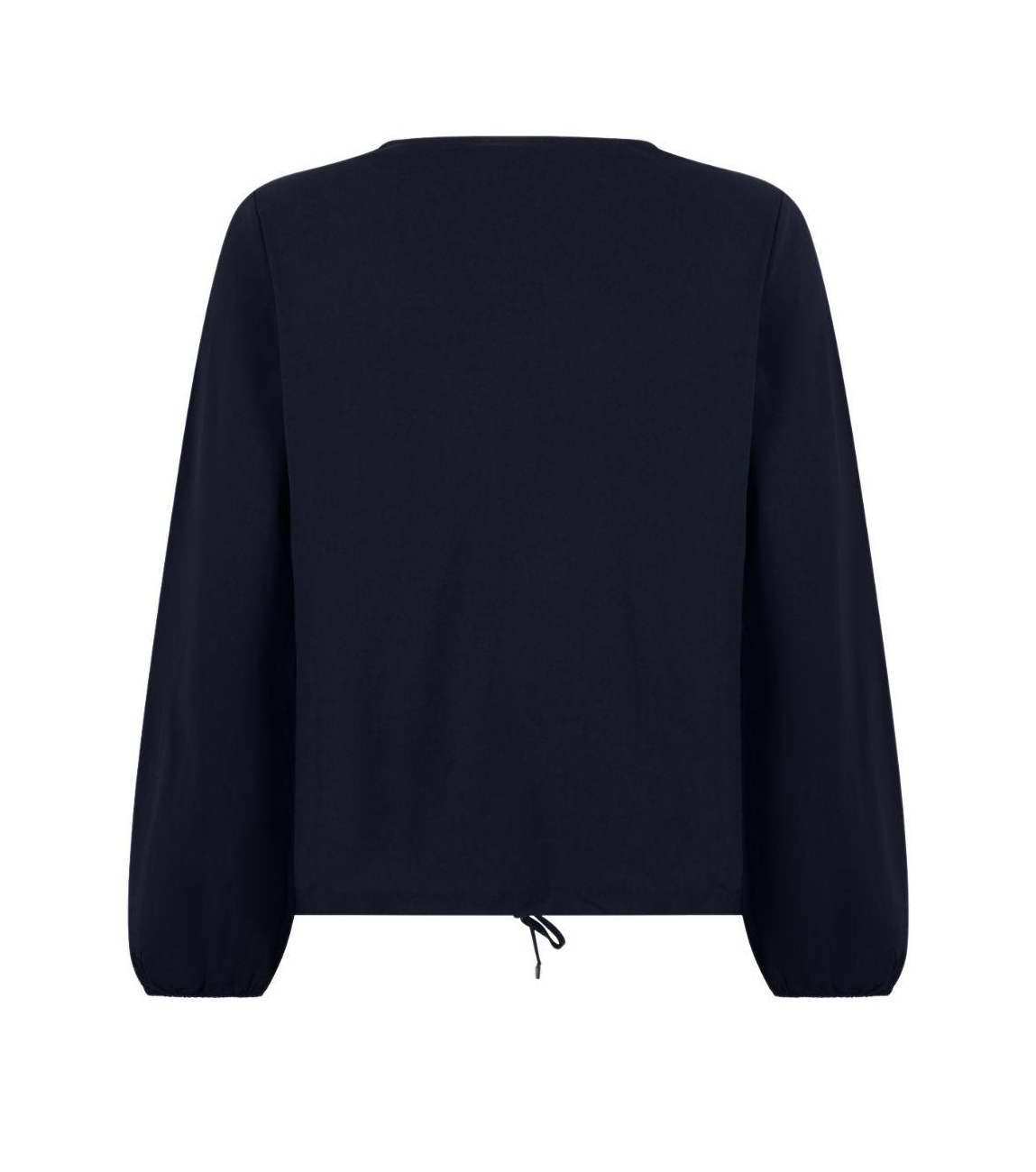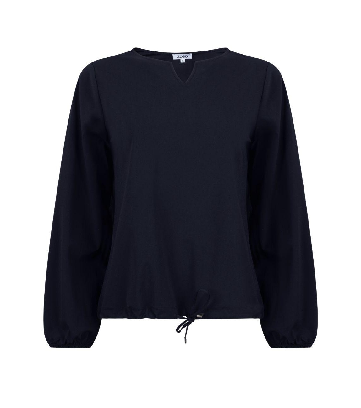 Zoso top Joan. Dit rechtvallend model is voorzien van een ronde hals met v-inkeping en heeft lange mouwen afgewerkt met elastische boorden. Deze donkerblauwe top van Zoso beschikt over trekkoorden aan de onderzijde.