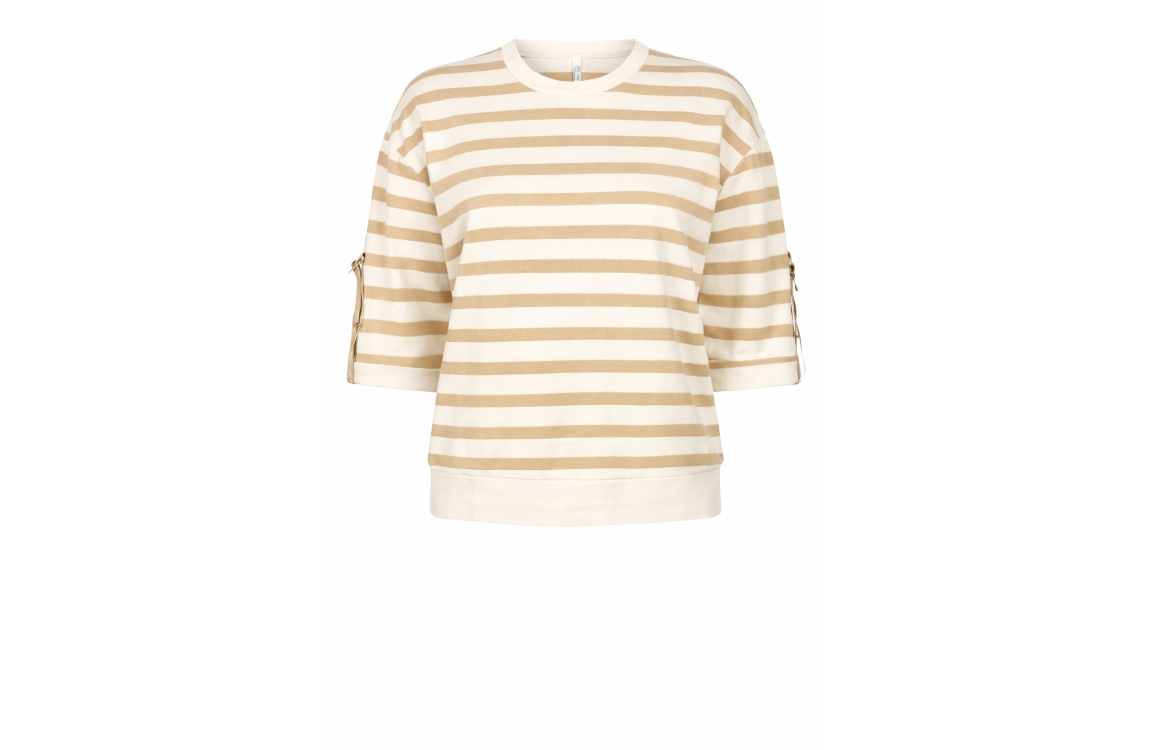 Zoso shirt Manon. Dit rechtvallend model is voorzien van een ronde hals en heeft driekwart mouwen. Deze lichtbruine shirt van Zoso is all-over bewerkt met witte strepen.