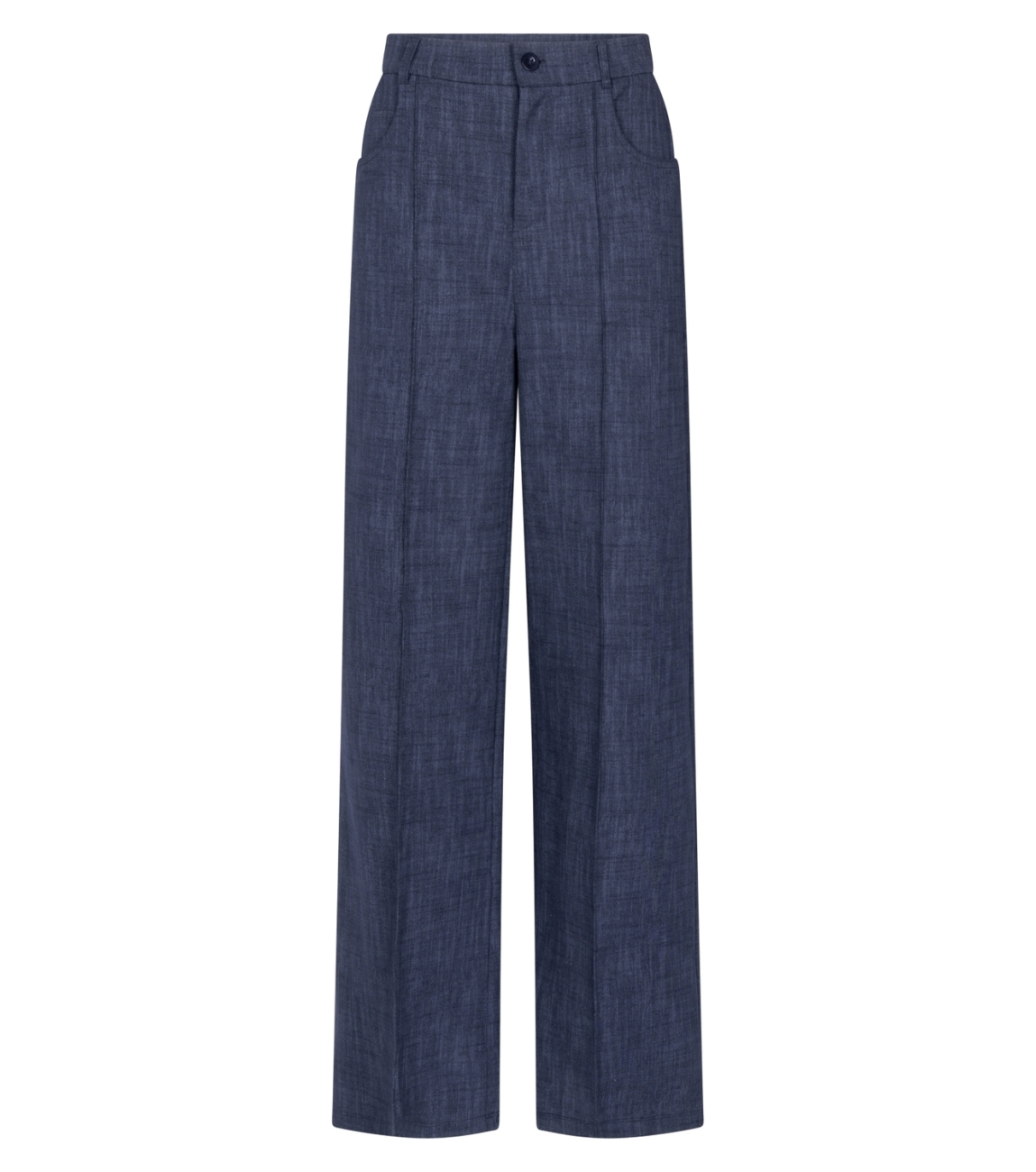 Zoso broek 254Megan. Dit rechtvallend model sluit door middel van een knoop en ritsaansluiting en heeft ceintuurlussen. Deze donker blauwe Zoso broek beschikt over twee steekzakken aan de voor- en achterzijde.