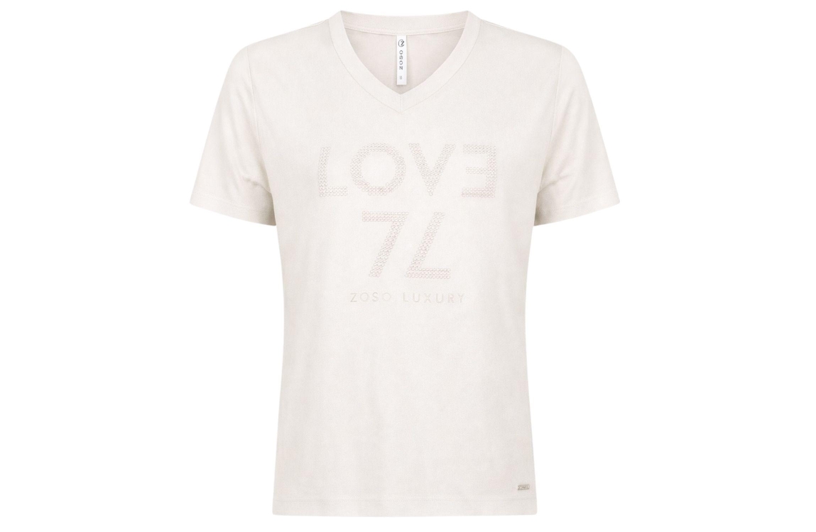 Zoso Melody 0021 kit. Dit rechtvallende model is voorzien van een v-hals en heeft korte mouwen. Dit kit kleurige T-shirt is op het voorpand bewerkt met een opdruk.