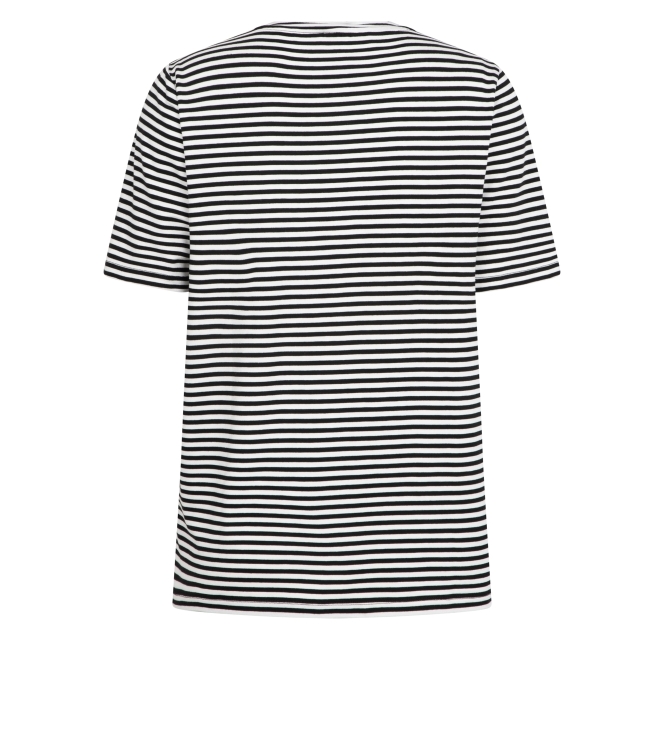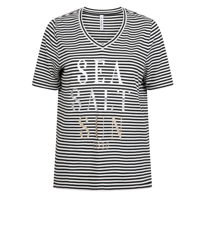 Zoso T-shirt 353 Merel. Dit rechtvallend model heeft een V-hals en korte mouwen. Deze zwarte T-shirt van Zoso is uitgevoerd in een streepprint en stretchkwaliteit. Het model is op het voorpand bewerkt met een letteropdruk in verschillende kleuren en heeft afgewerkte boorden.