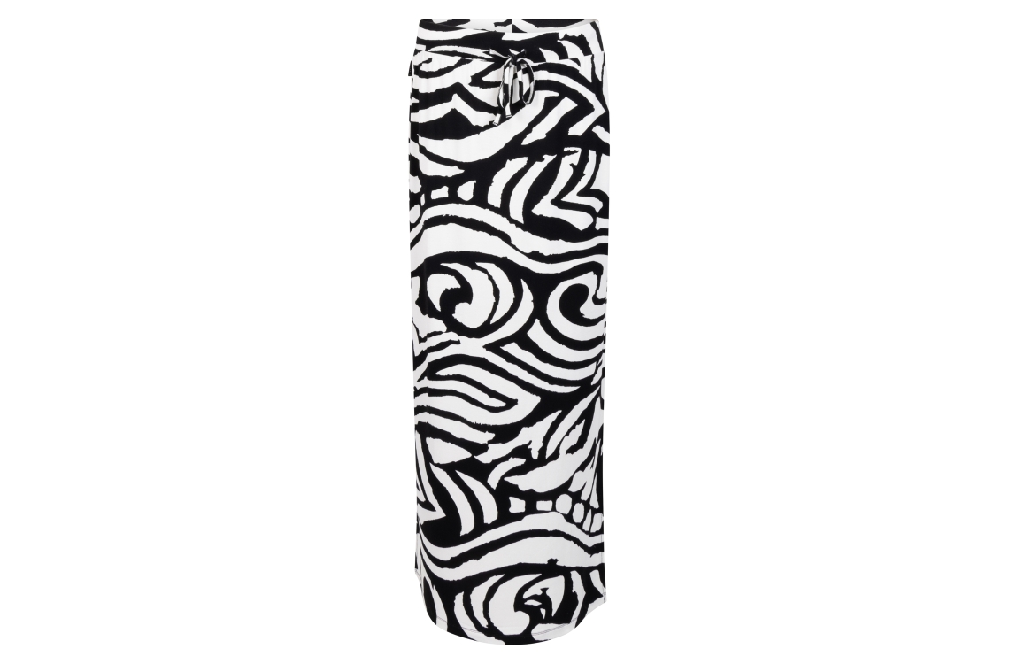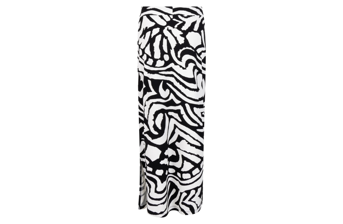 Zoso rok Mieke. Dit rechtvallend model sluit door middel van een elastische boord met trekkoorden. Deze zwart/witte lange rok van Zoso is bewerkt met een print.