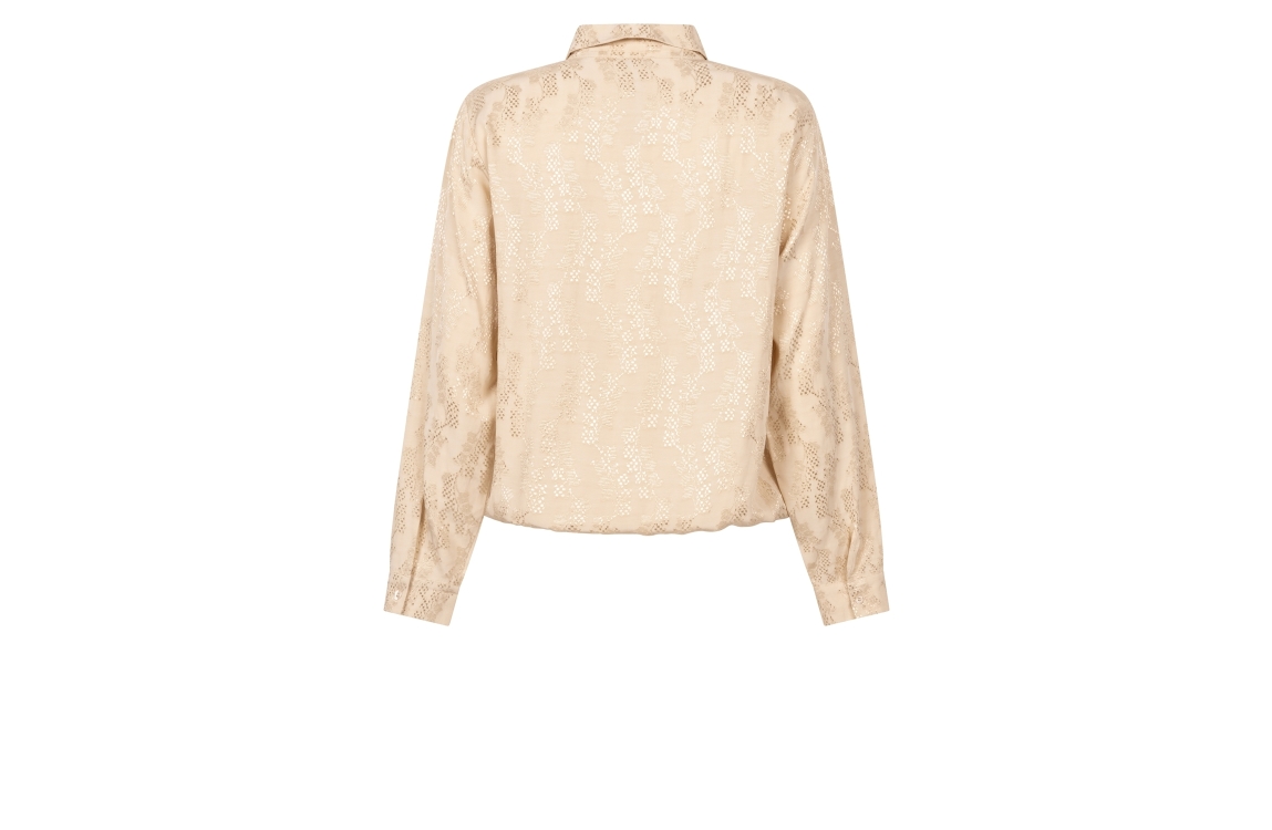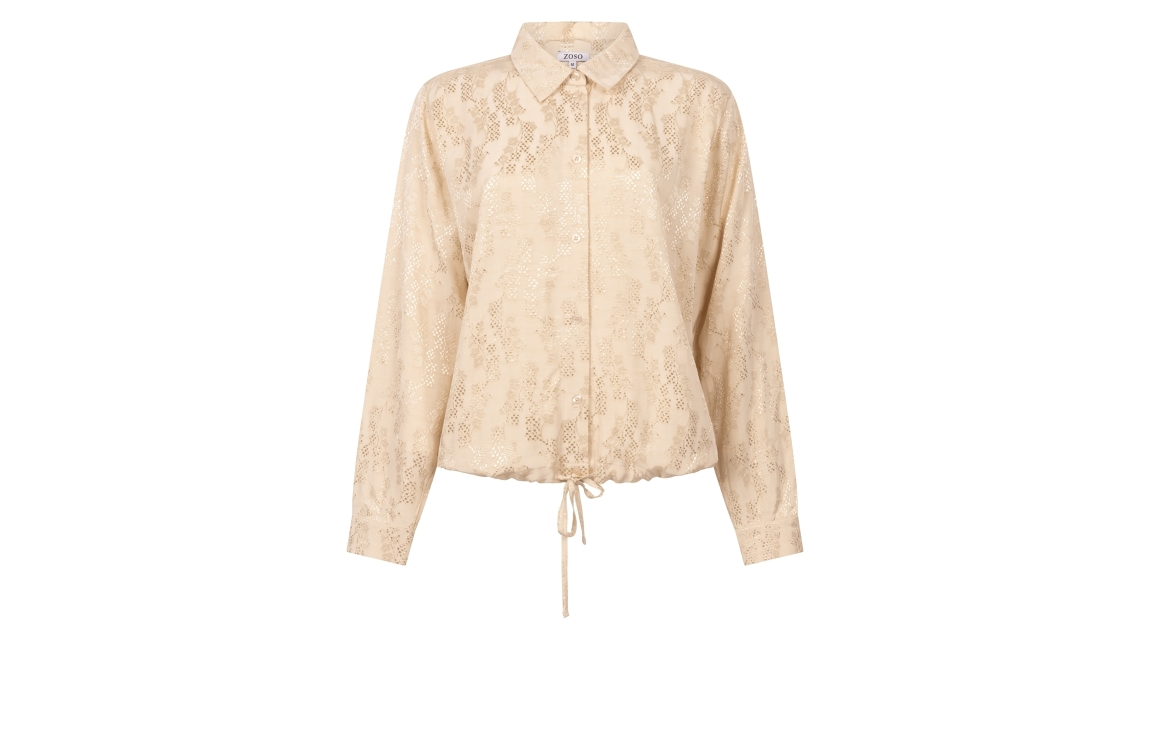 Zoso blouse Myrella. Dit rechtvallend model is voorzien van een kraag en heeft lange mouwen. Deze beige blouse van Zoso sluit door middel van knopen en beschikt over trekkoorden aan de onderzijde. Dit model is bewerlt met goudkleurige borduursel all-over.