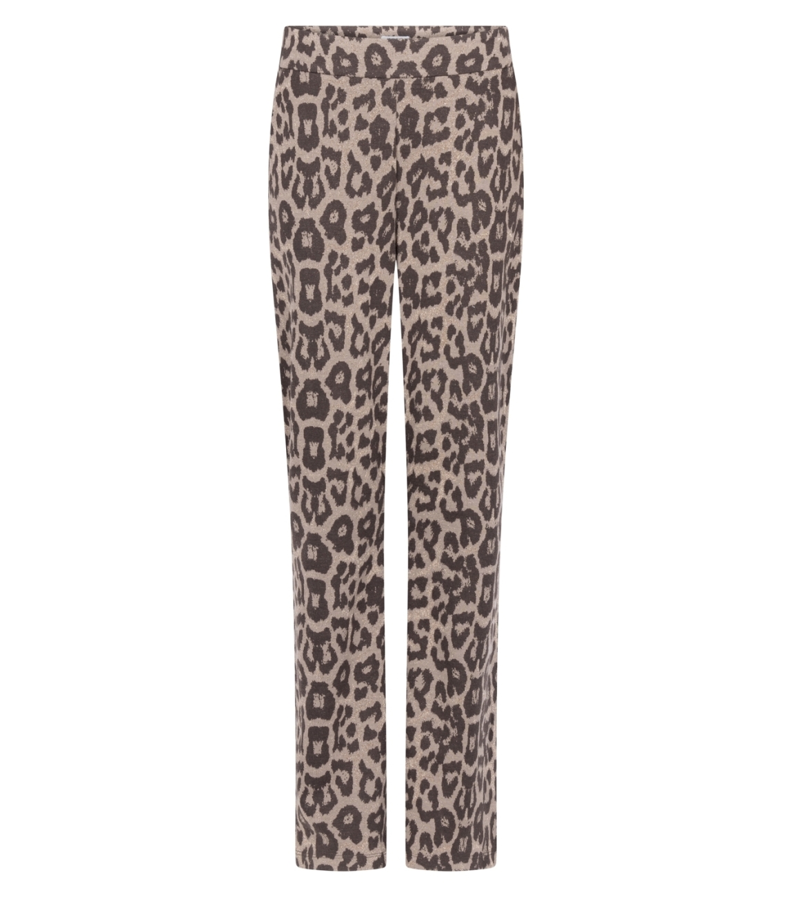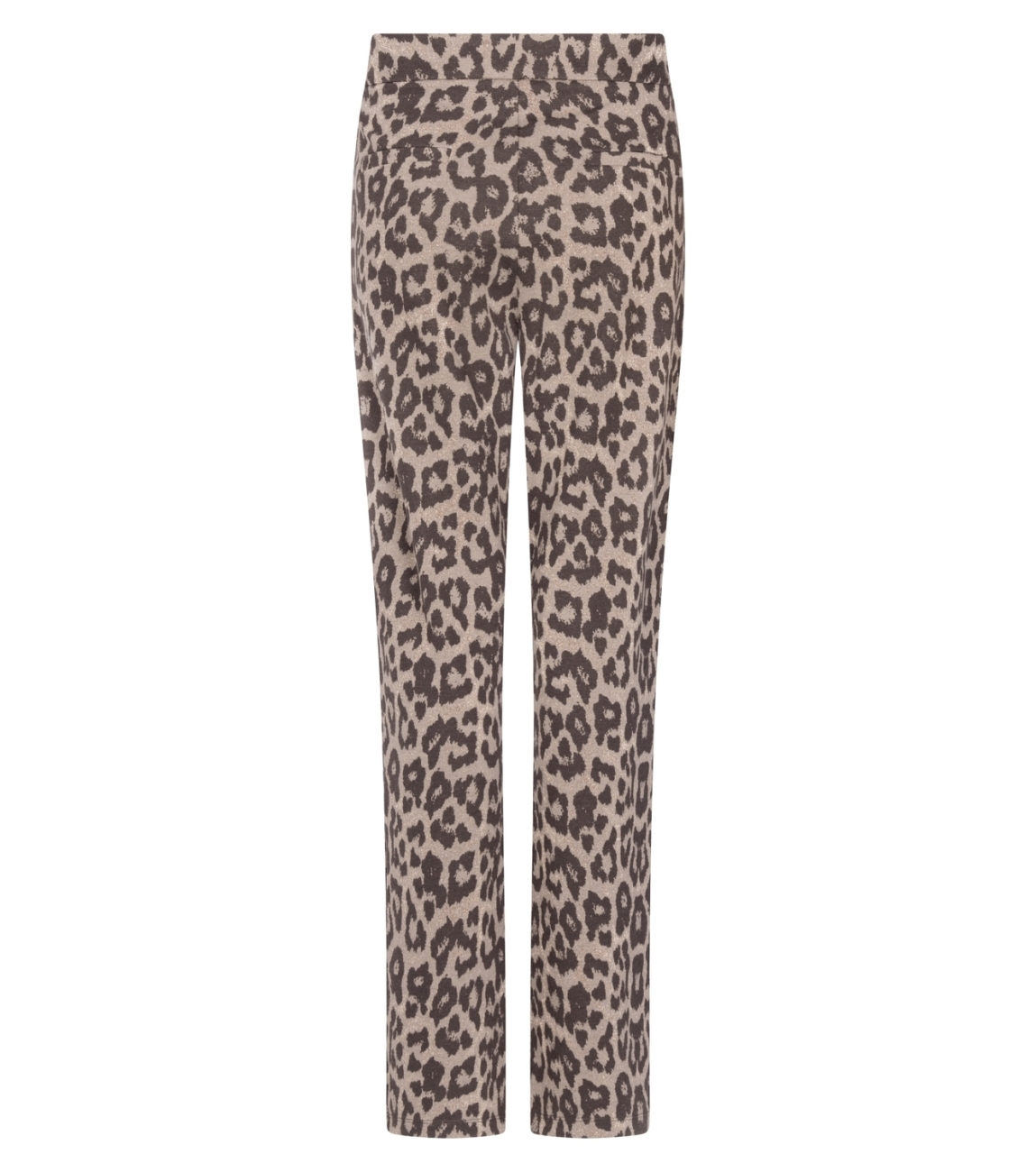 Zoso broek 254Netty. Dit rechtvallend fit model sluit door middel van een elastische boord. Deze bruine Zoso broek is bewerkt in een panter print met glitter detail. Dit model beschikt over twee steekzakken aan de voorzijde en twee paspelzakken aan de achterzijde.