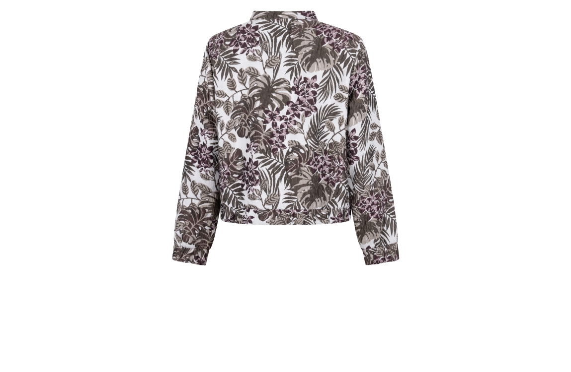 Zoso jasje 255Sandra 10002. Dit bombermodel heeft een ronde hals met opstaande kraag en lange mouwen. Deze bordeaux jasje van Zoso sluit aan de voorzijde door middel van een rits en is all-over bewerkt met een bloemenprint in verschillende kleuren. Het model is voorzien van twee steekzakken en heeft elastische boorden.