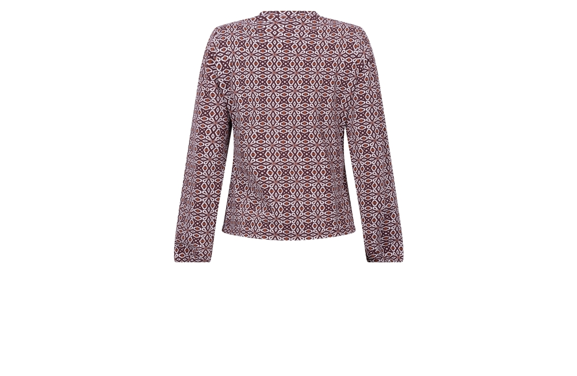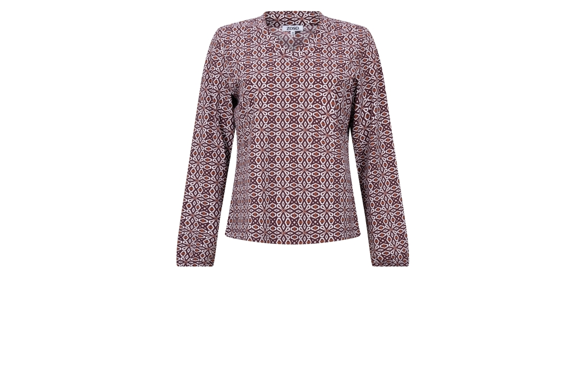 Zoso shirt Vanessa. Dit rechtvallend model is voorzien van een v-hals en heeft lange mouwen. Deze witte/bordeaux kleurige shirt van Zoso is all-over bewerkt met een grafische print.