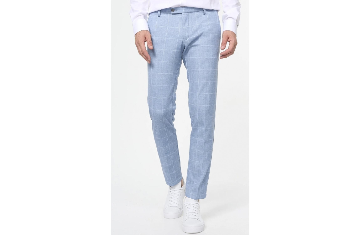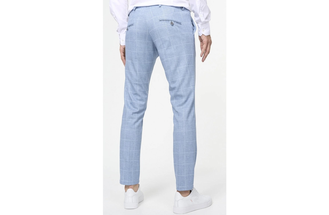 Zuitable broek 241668. Deze slimfit broek is voorzien van ceintuurlussen en heeft twee steekzakken en twee achterzakken, Deze lichtblauw wit geblokte broek sluit door middel van knoop, rits en koord. het colbert is appart verkrijgbaar.