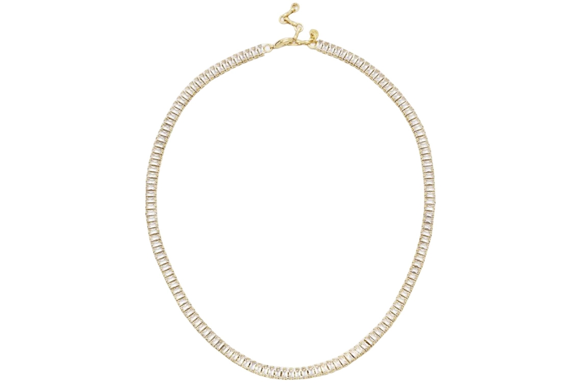 Abrazi baguette ketting KC-BQ. Deze ketting is bewerkt met baguette geslepen kristallen en uitgevoerd in een gouden plating. De ketting is 42cm lang.