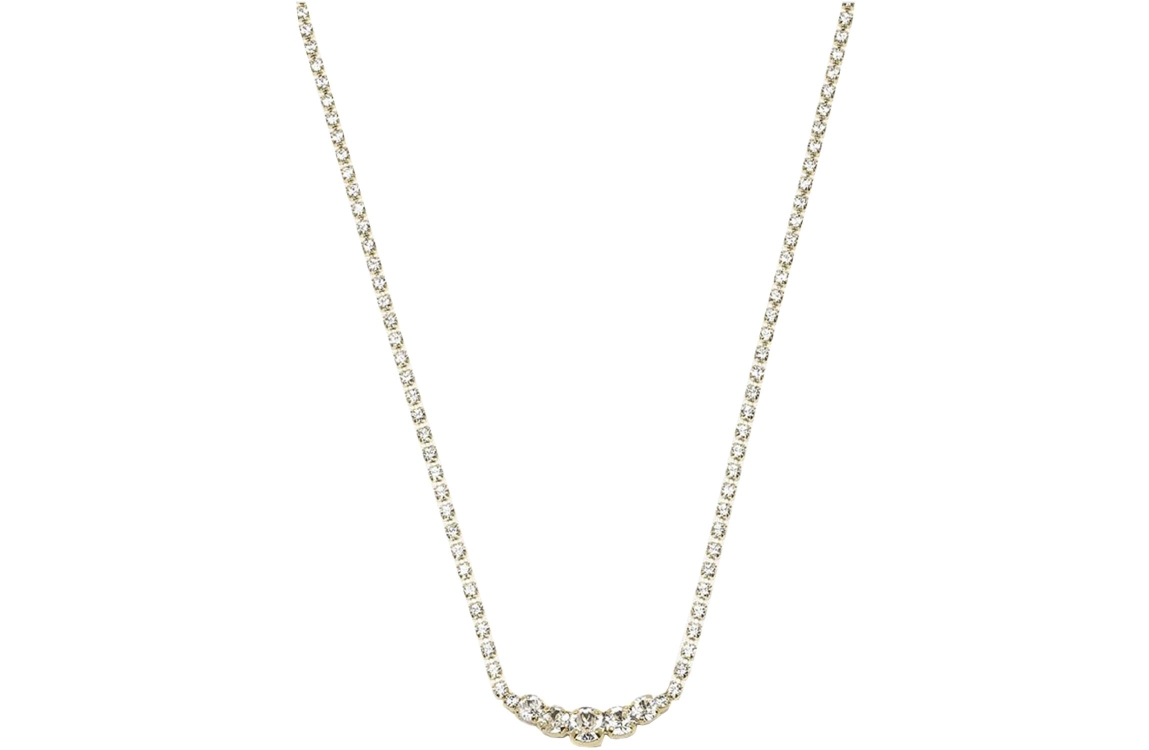 Abrazi ketting Royal KC-RNDXS. Deze gouden ketting is bewerkt met een enkele rij kristallen afgewerkt met grotere kristallen in het midden. De ketting is 46 cm lang en is gemaakt van een duurzame messing.