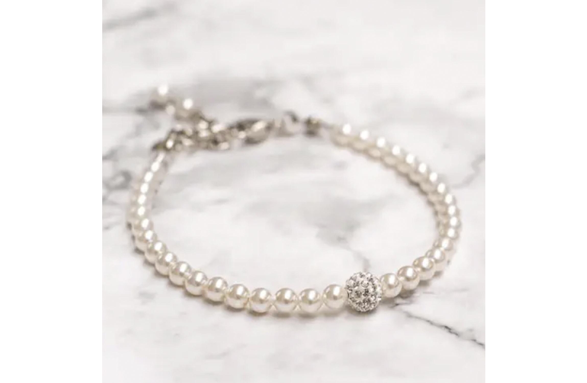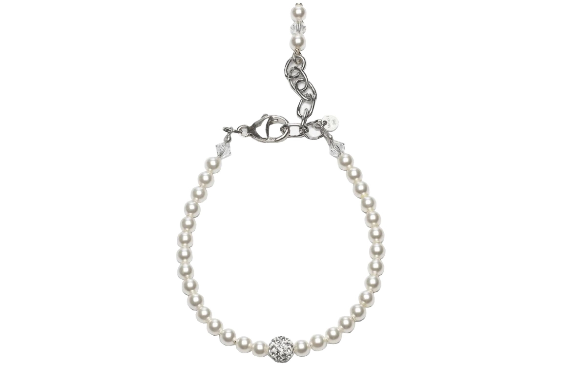 Abrazi parelarmband Selena A1-4-650-MC-1 4mm. Deze zilveren parelarmband is gemaakt van Swarovski-parels afgewerkt met een kristallen parel in het midden. De armband is 18 cm lang en beschikt over een sluiting van 925 sterling zilver.