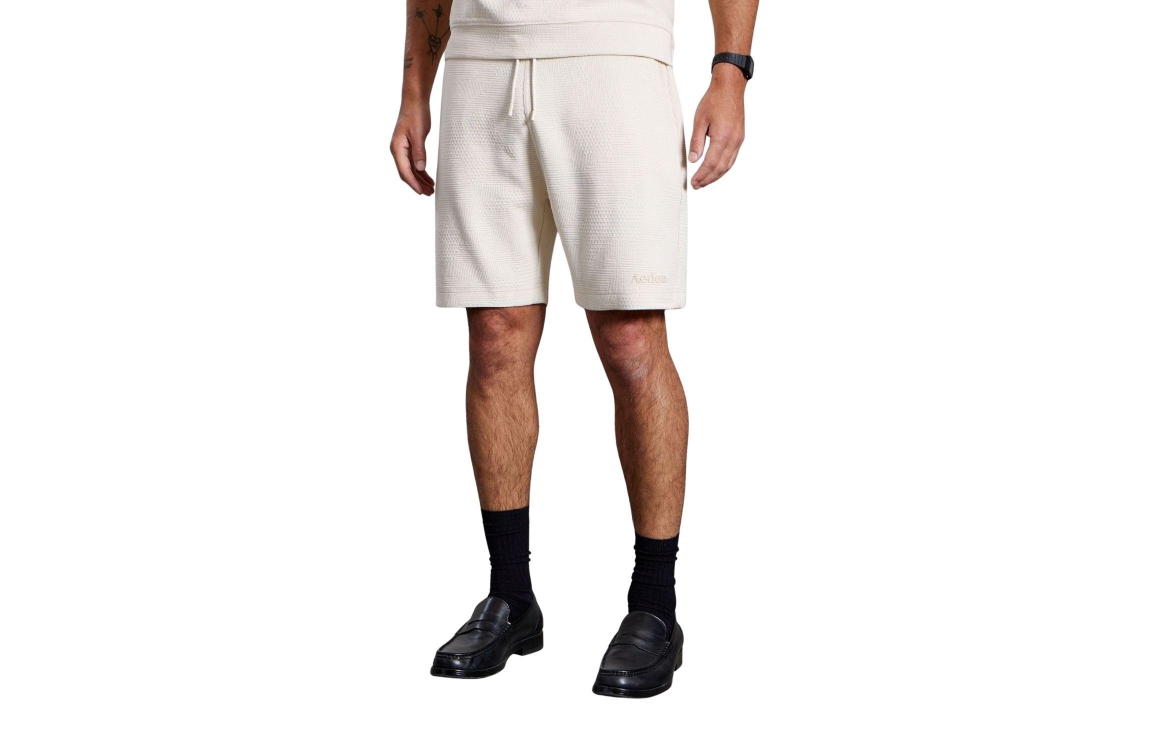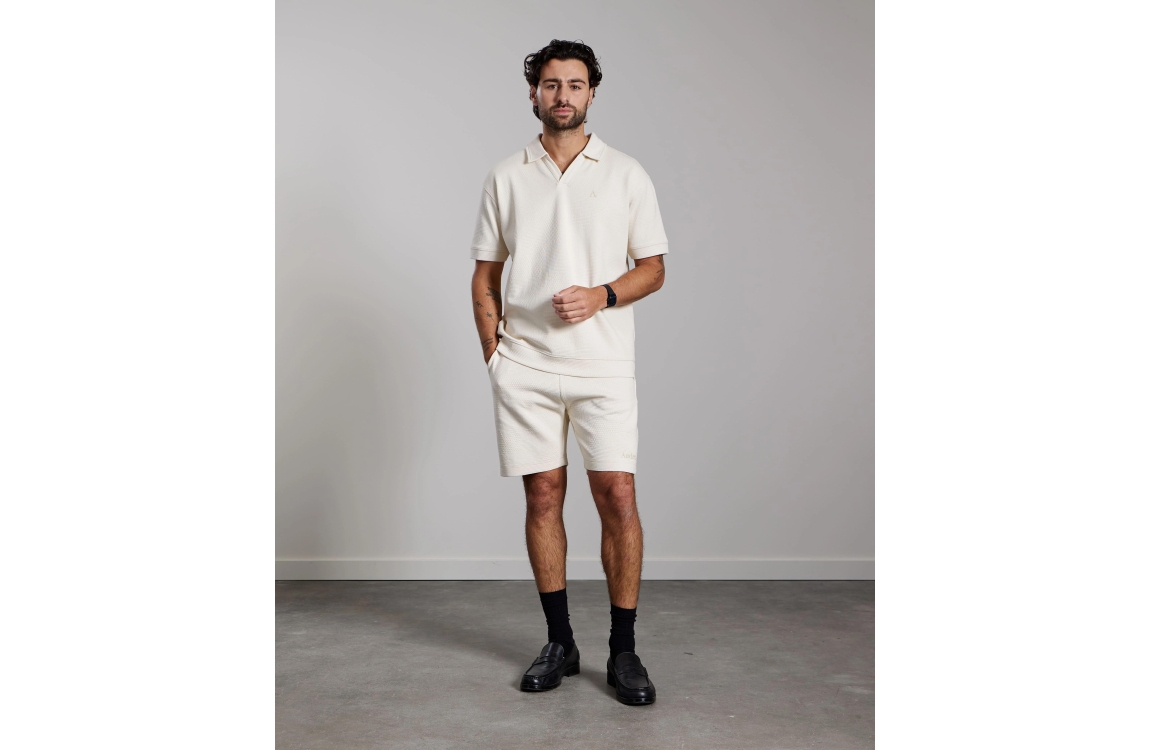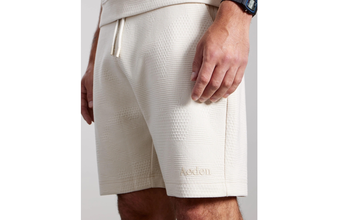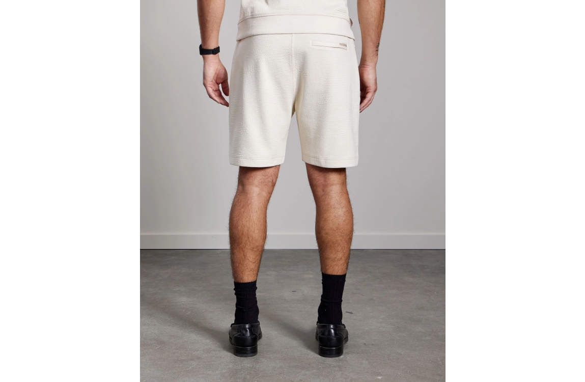 Aeden Damir Shorts Off-white-101. Dit regular fit model sluit door middel van een elastische boord met trekkoord. Deze off-white short van Aeden is voorzien van twee steekzakken aan de voorzijde en een paspelzak aan de achterzijde. Dit model is all-over bewerkt met een structuur.