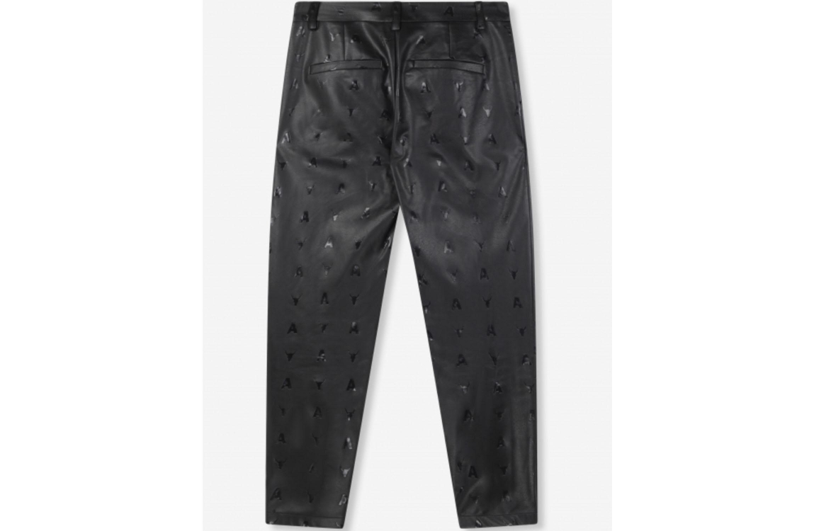 Alix the Label broek 2308112318. Dit mom jeans model is voorzien van riemlusjes en sluit door middel van knoop en rits. Deze zwarte broek van Alix the Label is uitgevoerd in een debossed faux leather met een ingeslagen logo relief  en heeft steekzakken aan de voorzijde en decoratieve paspelzakken aan de achterzijde.