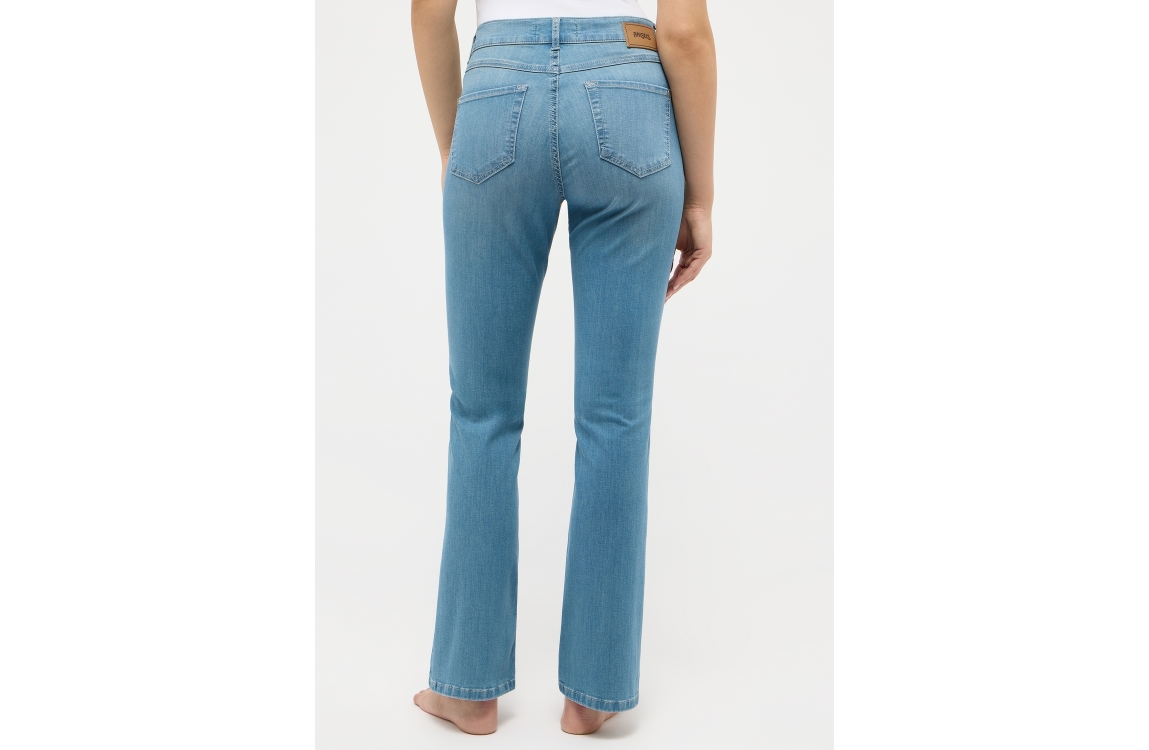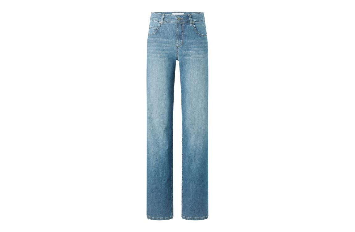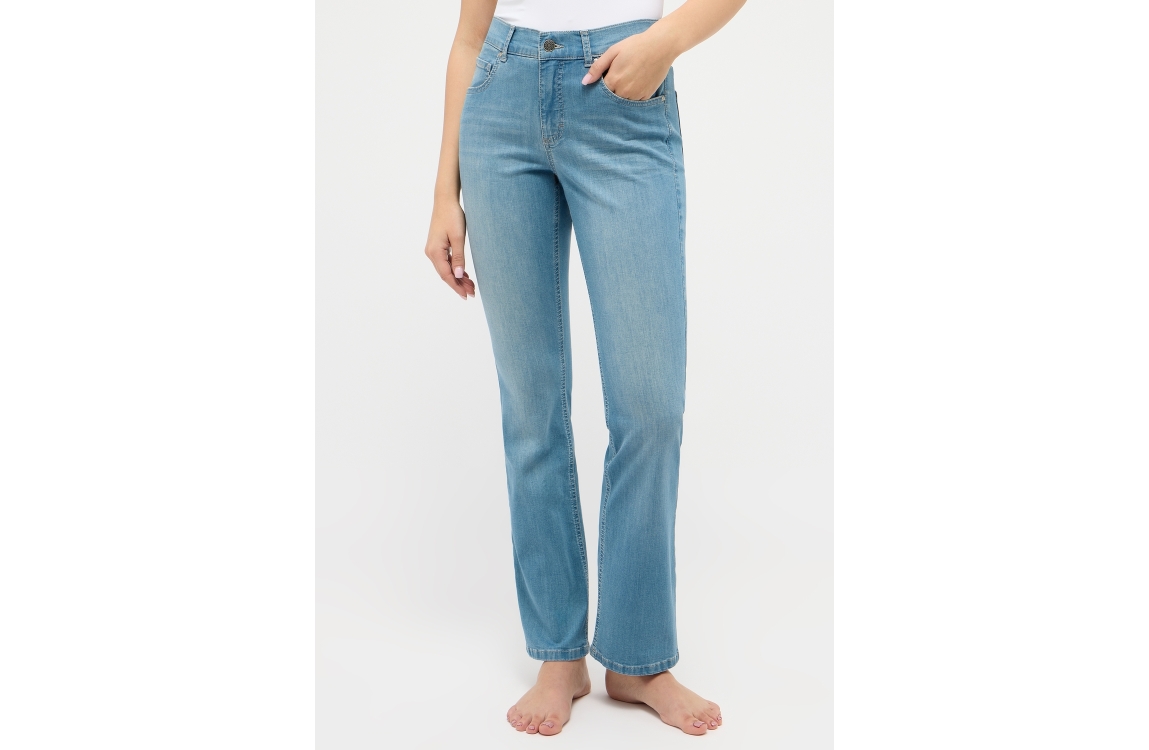 Angels jeans Leni 3338900-3458. Dit bootcut model sluit door middel van een knoop en rits afgewerkt met ceintuurlussen. Deze lichte denim jeans van Angels en is uitgevoerd in een 5-pocket model.