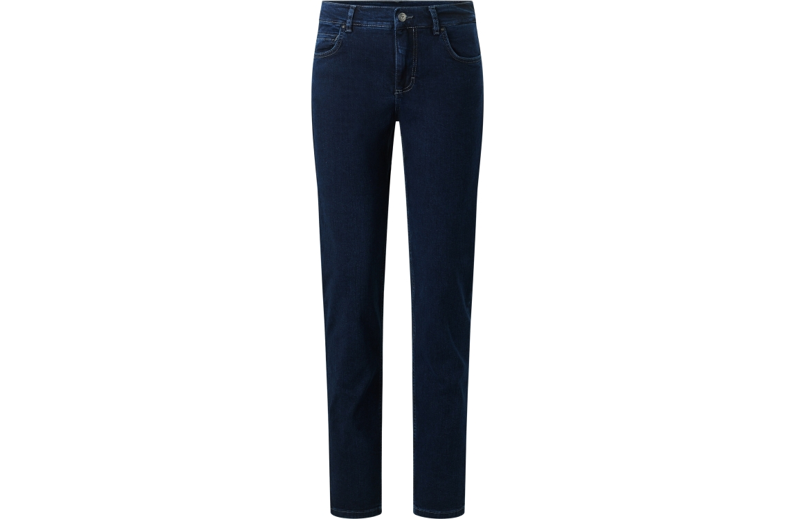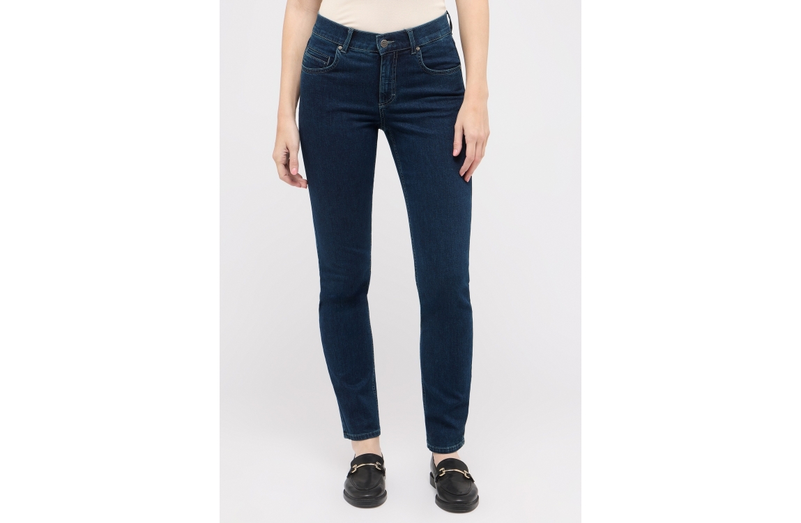 Angels jeans CICI 5334. Dit slim fit sluit door middel van een knoop en rits afgewerkt met ceintuurlussen. Deze donkerblauwe jeans van Angels is uitgevoerd in een 5-pocket model.