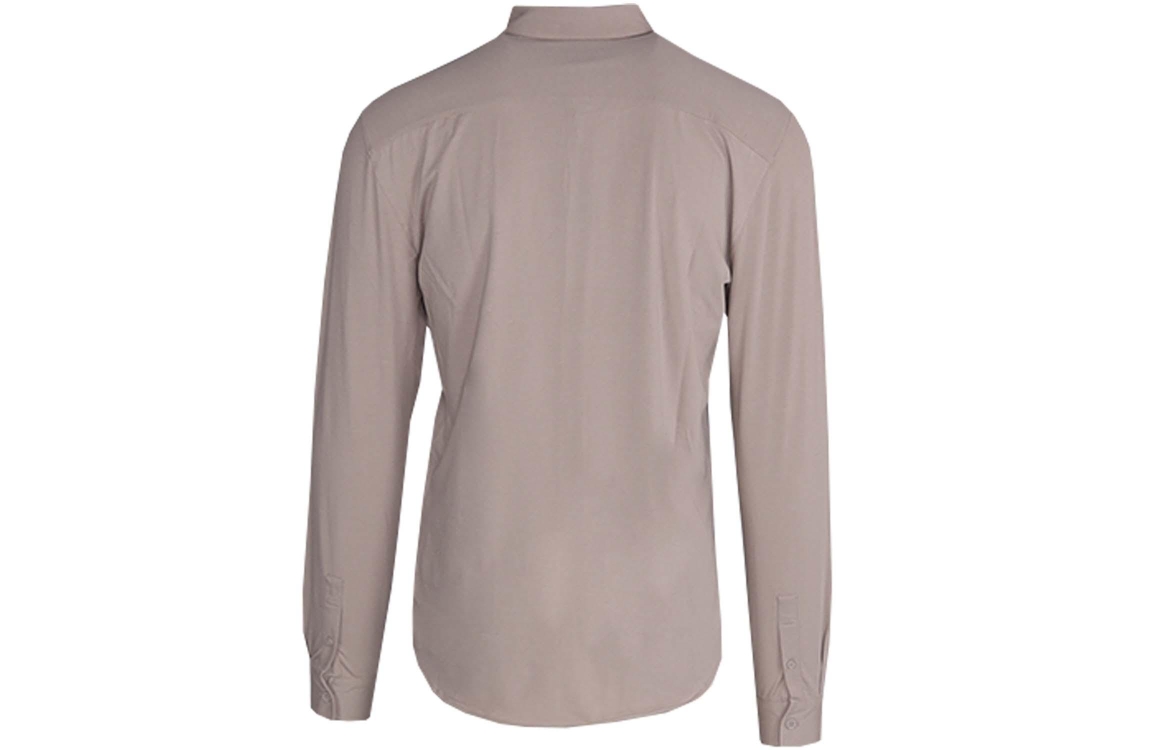 Armani Exchange overhemd. Dit aangesloten model heeft lange mouwen en is doormiddel van knopen te sluiten. Deze beige overhemd van Armani Exchange is afgewerkt met een merkembleem op de linker borst.