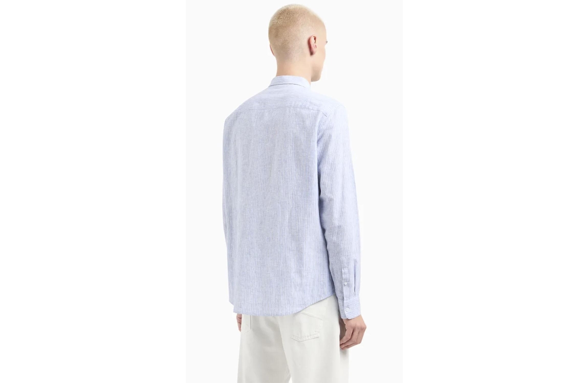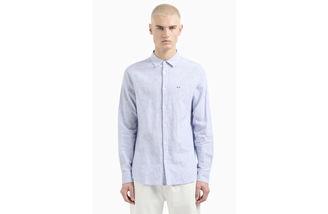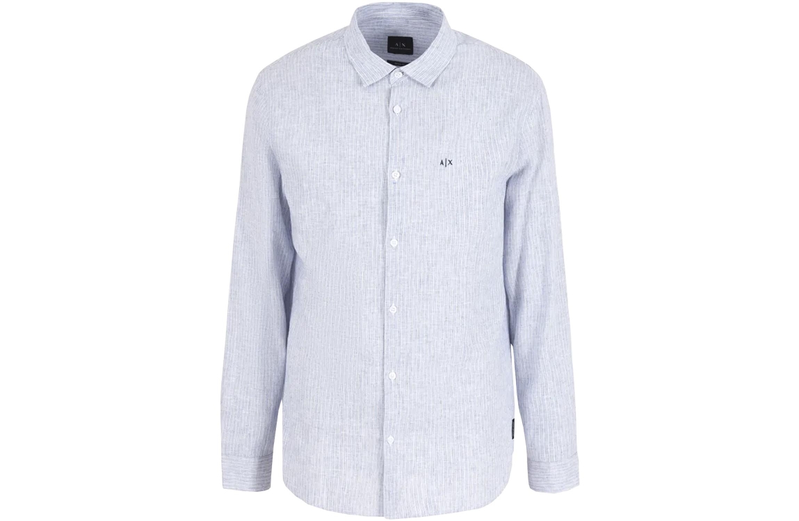 Armani Exchange overhemd 3dzc32. Dit Regular fit model is voorzien van een kraag en heeft lange mouwen. Dit lichtblauw gestreepte overhemd van Armani Exchange sluit door middel van knopen en is bewerkt met een geborduurd merkembleem op de borst. Dit model is uitgevoerd in een linnen kwaliteit.
