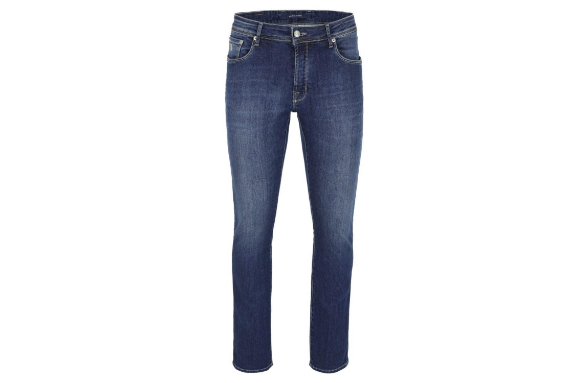 Atelier Noterman jeans ATN01S-A58. Dit aangesloten model sluit door middel van knopen en een rits. Deze donkerblauwe denim jeans van Atelier Noterman is uitgevoerd in een 5-pocket model met verschillende zakken en afgewerkt met branding borduring op de voorzak en op de achterzijde.