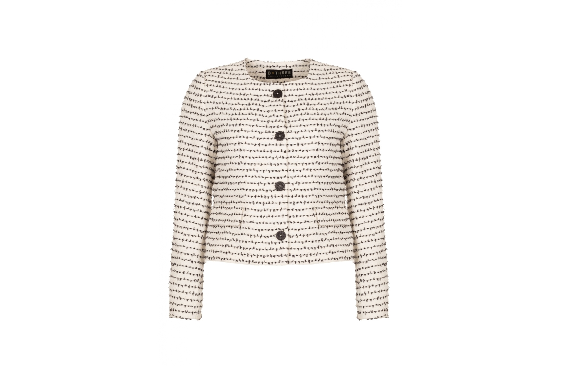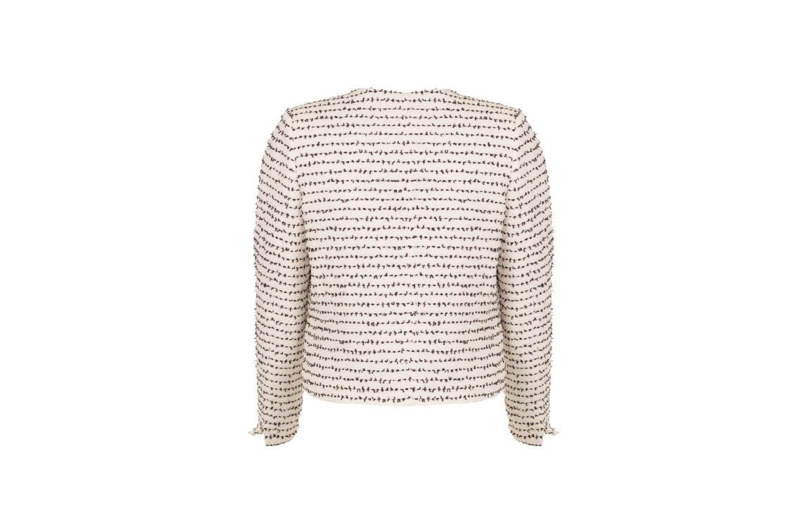 B-Three blazer Ibiza 3/2027. Dit korte model is voorzien van een ronde hals en heeft lange mouwen. Deze off-white/ blauw gestreepte blazer van B-Three sluit door middel van knopen en heeft splitjes in de mouwen.