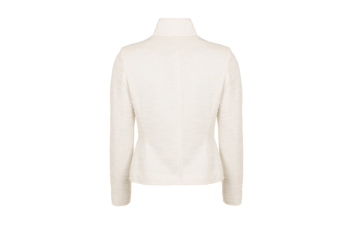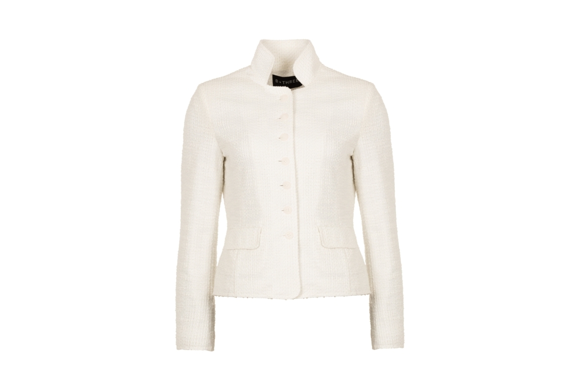 B-Three blazer 250016. Dit licht getailleerde model is voorzien van een opstaande kraag en heeft lange mouwen. Deze off-white jasje van B-Three sluit door middel van knopen en beschikt over twee klepzakken.