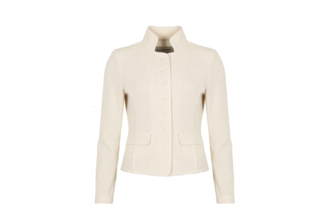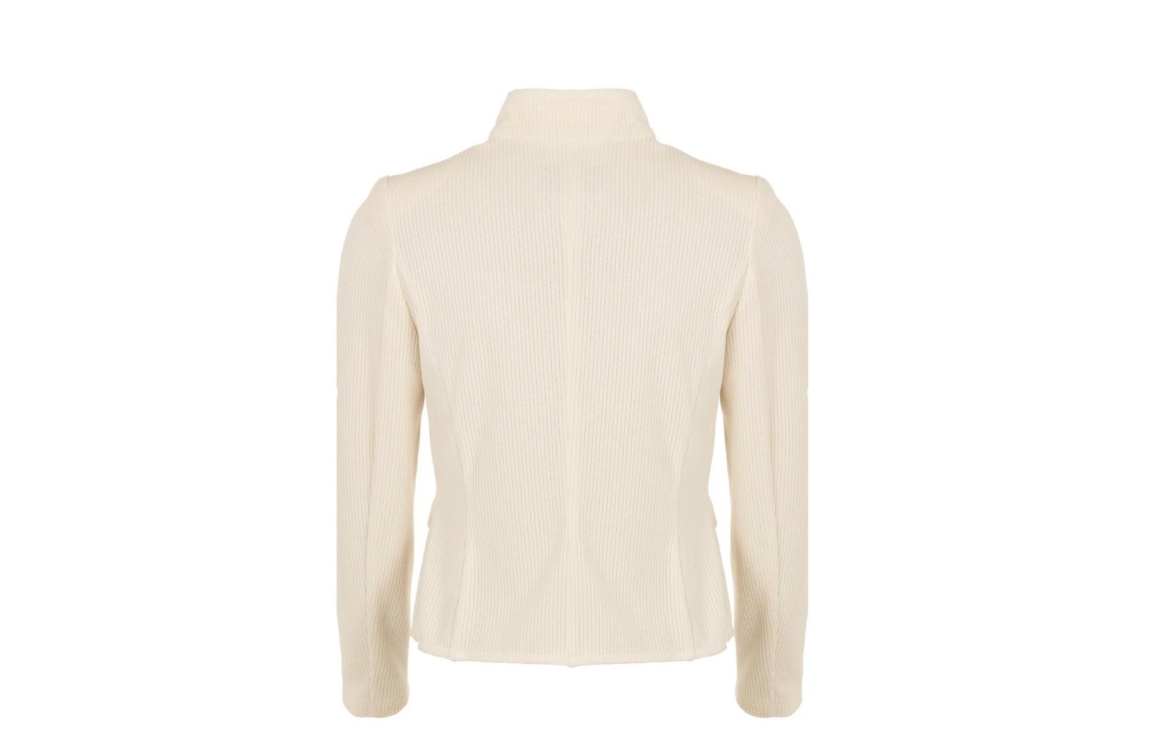 B-Three blazer Teresa. Dit rechtvallend model heeft een opstaande kraag en lange mouwen. Deze off white (ivory) blazer van B-Three sluit aan de voorzijde door middel van knopen en beschikt over twee klepzakken. Het model is voorzien van schoudervulling en is uitgevoerd met een stevig stof structuur.