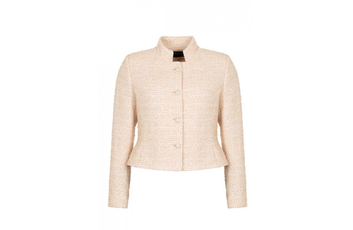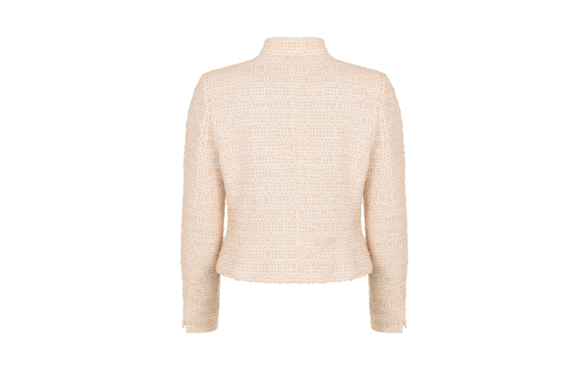 B-Three jasje Virgie. Dit aangesloten model is voorzien van een opstaande kraag en heeft lange mouwen Deze beige jasje van B-Three sluit aan de voorzijde door middel van knopen en is uitgevoerd in een boucle stof.