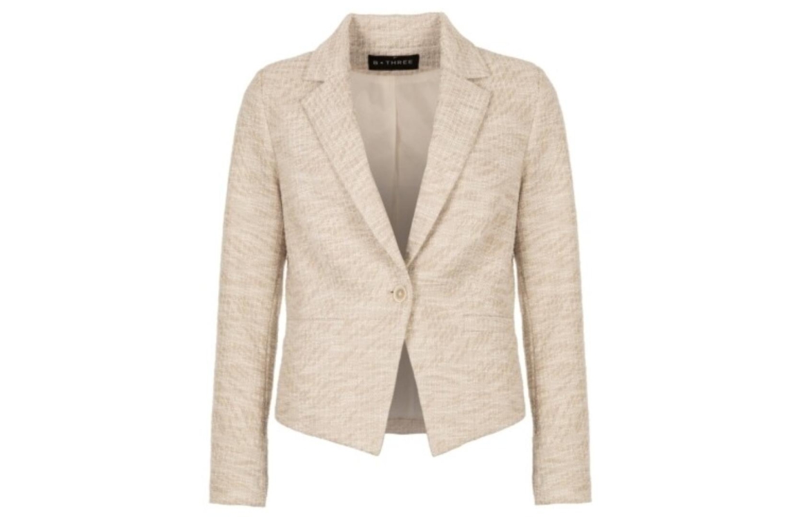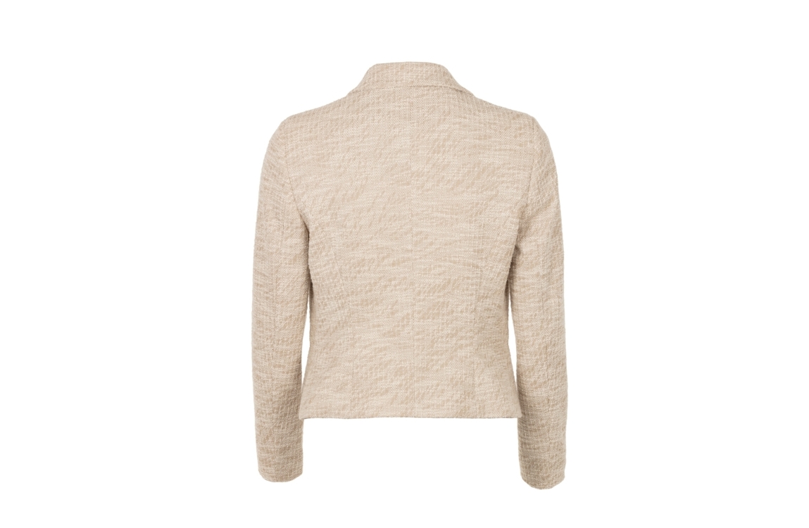 B-Three blazer Saffron 250017. Dit getailleerde model heeft een rever kraag en lange mouwen. Deze beige blazer van B-Three sluit door middel van knopen en is uitgevoerd in een bouclé stof.