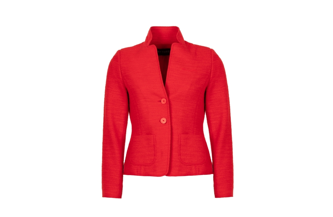 B-Three blazer Selia. Dit getailleerde model heeft een opstaande kraag en lange mouwen. Deze rode blazer van B-Three is aan de voorzijde voorzien van twee opgestikte zakken en sluit door middel van knopen. Het model is uitgevoerd in tweedstof.