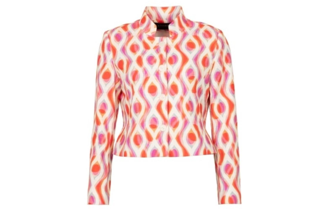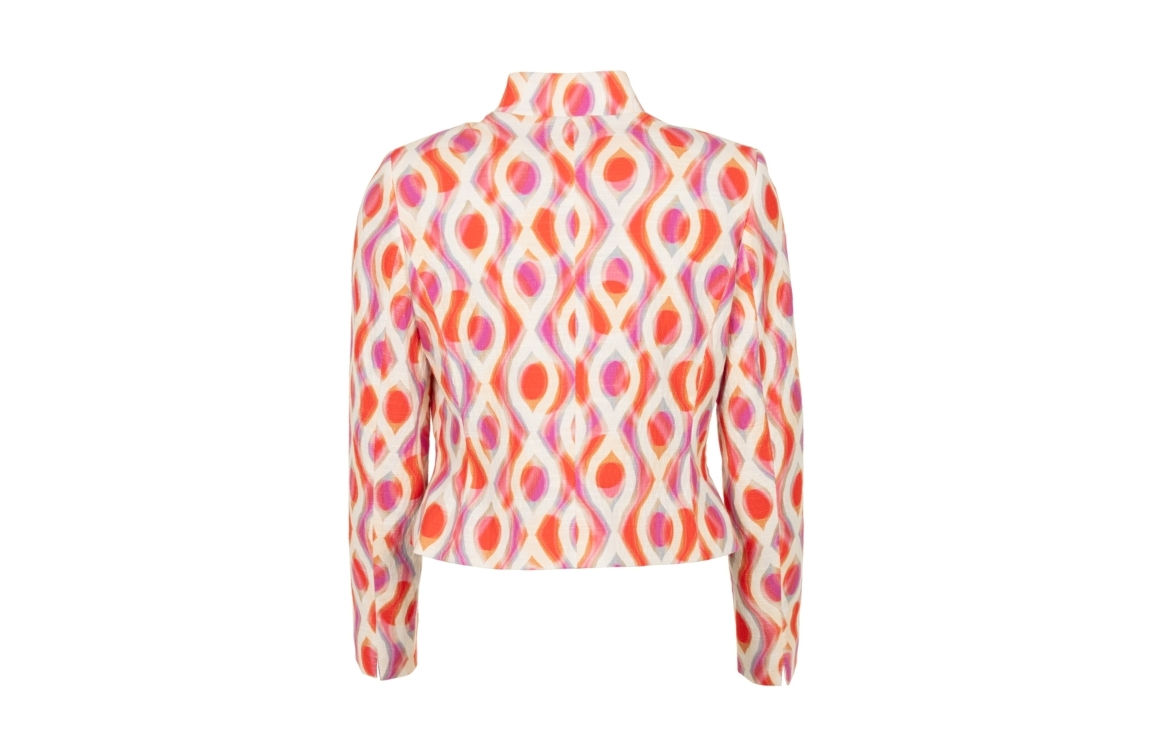 B-Three blazer Sandra 250054. Dit getailleerde model is voorzien van een opstaande kraag en heeft lange mouwen. Deze multicolour blazer van B-Three sluit door middel van knopen. Dit model is all-over bewerkt met een print en is afgewerkt met schoudervullingen.