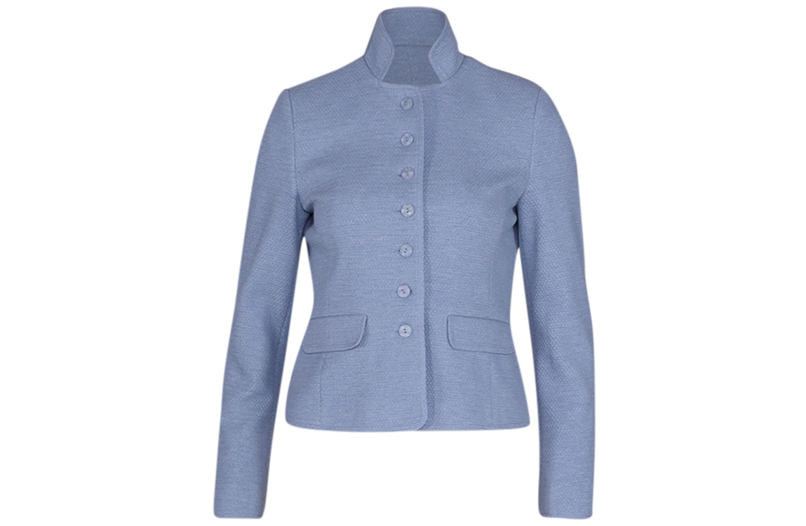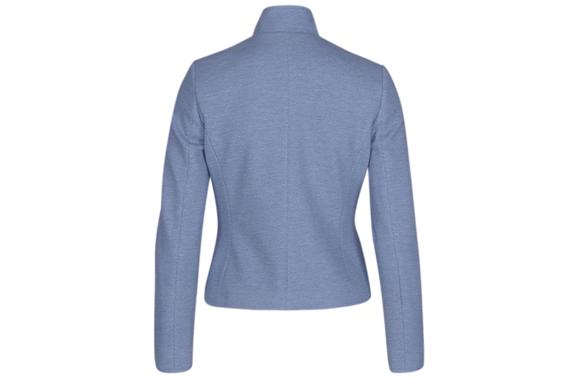 B-Three blazer 250016. Dit licht getailleerde model is voorzien van een opstaande kraag en heeft lange mouwen. Dit blauwe jasje van B-Three sluit door middel van knopen en beschikt over twee klepzakken.