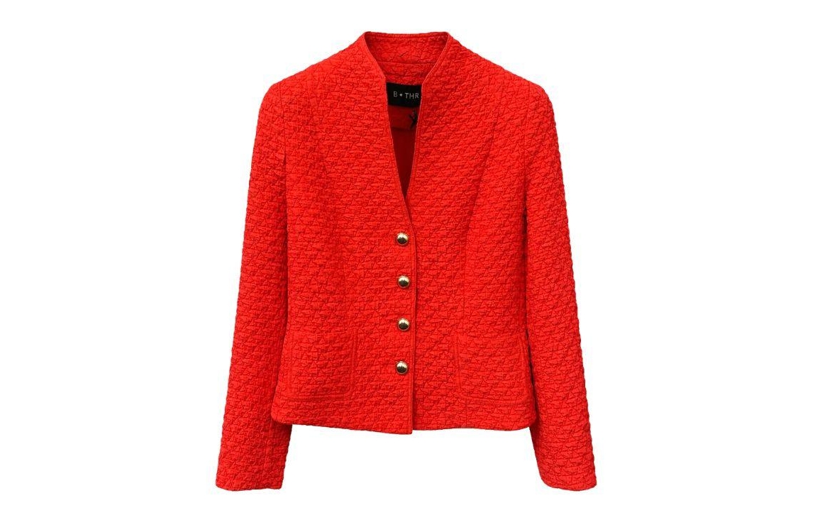 B-Three blazer 260024 JASMYN 349. Dit licht getailleerde model heeft een opstaande kraag met een diepe V-inkeping en lange mouwen. Deze rode blazer van B-Three is uitgevoerd in een crinklestructuur en sluit met decoratieve knopen. Het model is voorzien van twee opgestikte zakken en schoudervullingen.