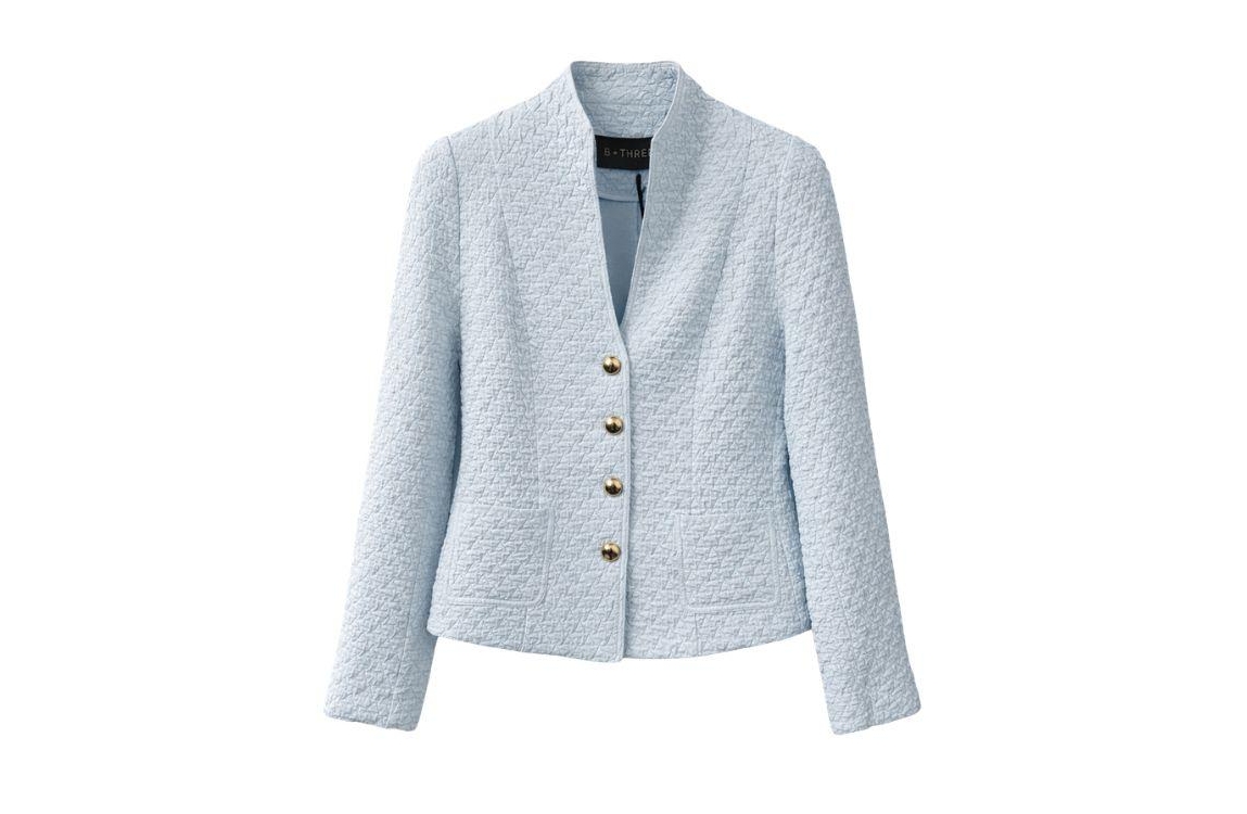 B-Three blazer 260024 JASMYN 420. Dit licht getailleerde model heeft een opstaande kraag met een diepe V-inkeping en lange mouwen. Deze lichtblauwe blazer van B-Three is uitgevoerd in een crinklestructuur en sluit met decoratieve knopen. Het model is voorzien van twee opgestikte zakken en schoudervullingen.