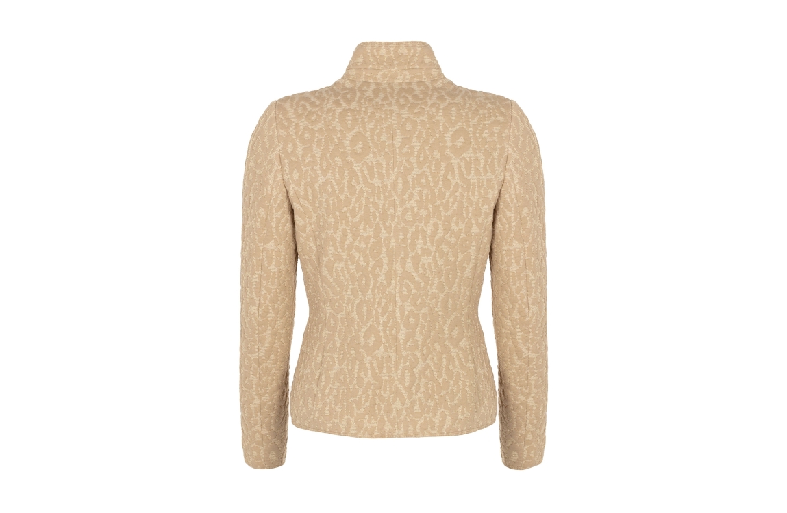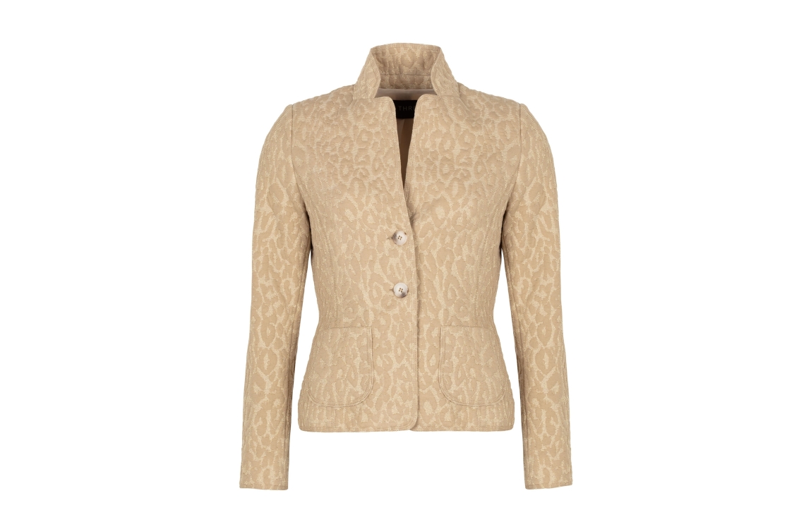 B-Three blazer 260012 Jayna 732.. Dit licht getailleerd model heeft een opstaande kraag en lange mouwen. Deze camelkleurige blazer van B-Three sluit aan de voorzijde door middel van knopen en is all-over bewerkt met een leopard print afgewerkt met glitter. Het model is voorzien van twee zakken.
