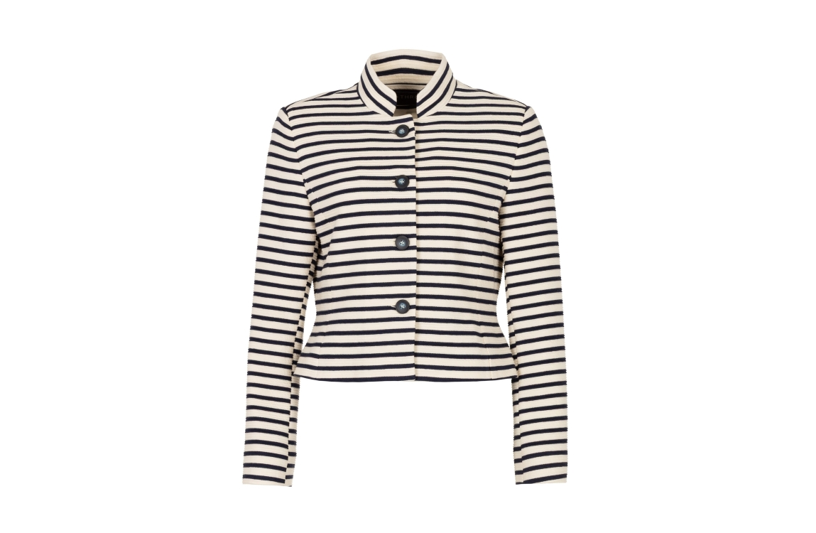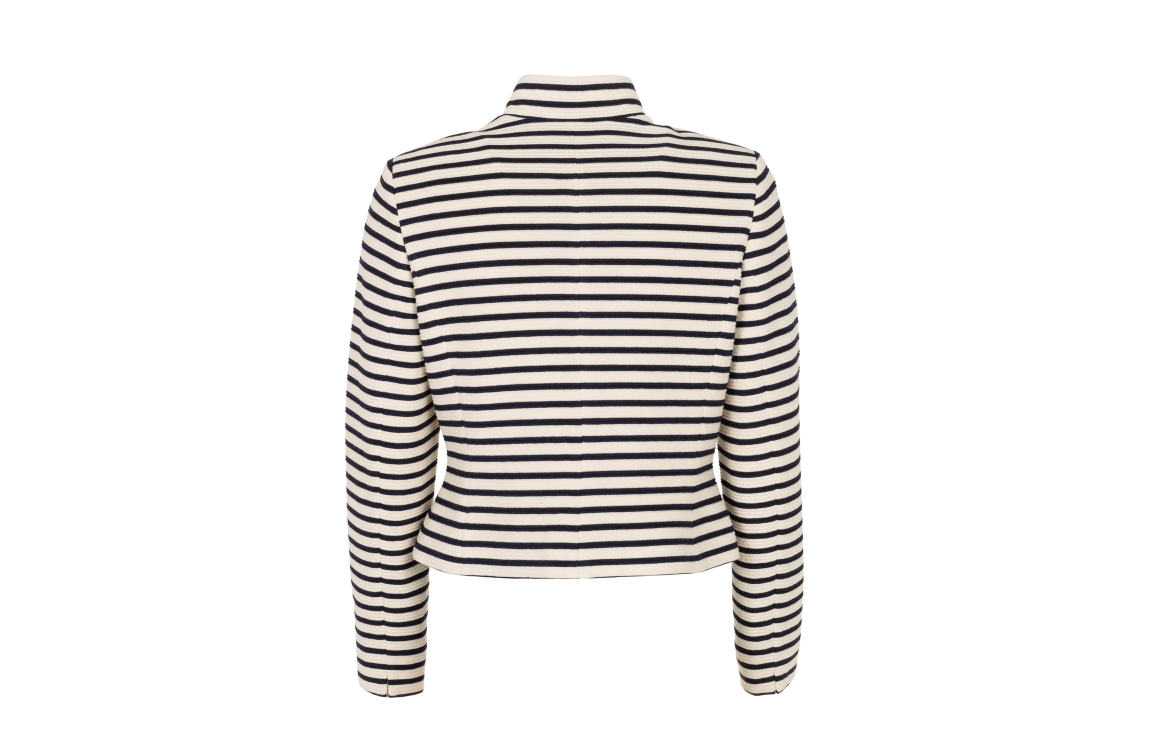 B-Three blazer 260005 JENELLE 496. Dit licht getailleerd model heeft een opstaande kraag en lange mouwen. Deze donkerblauwe blazer van B-Three sluit aan de voorzijde door middel van knopen en is uitgevoerd met een cremekleurige streepprint.