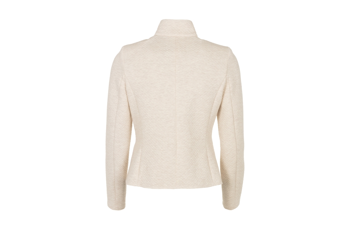 B-Three June 134 Sand blazer. Dit licht getailleerde model is voorzien van een opstaande kraag en heeft lange mouwen. Dit beige jasje van B-Three sluit door middel van knopen en beschikt over twee klepzakken.