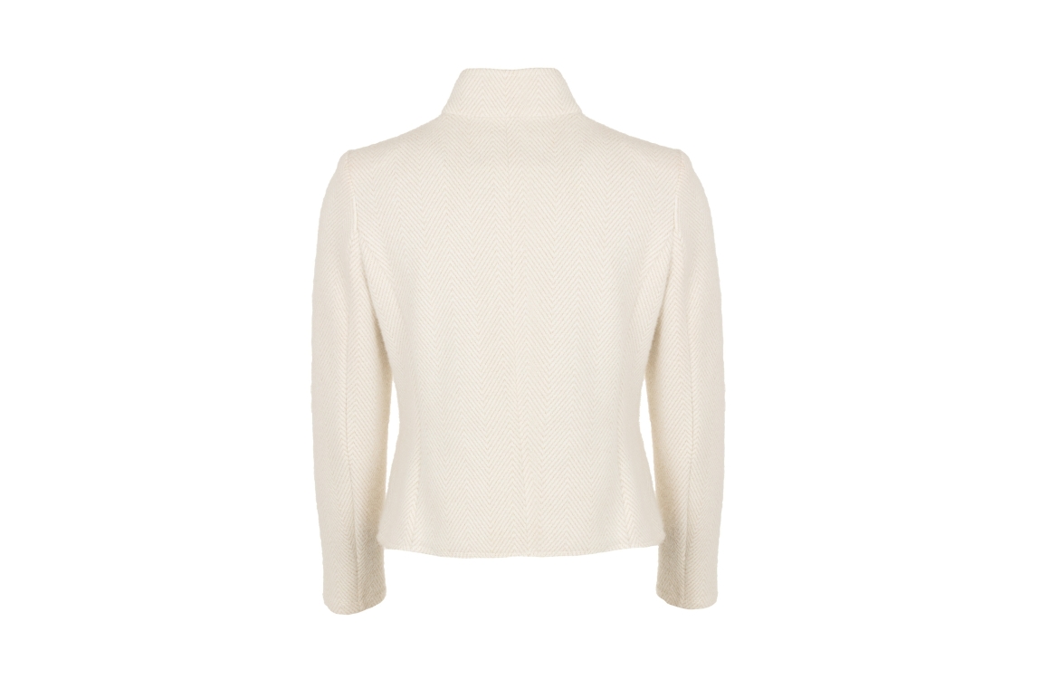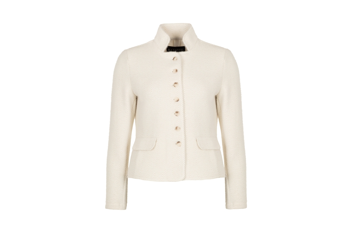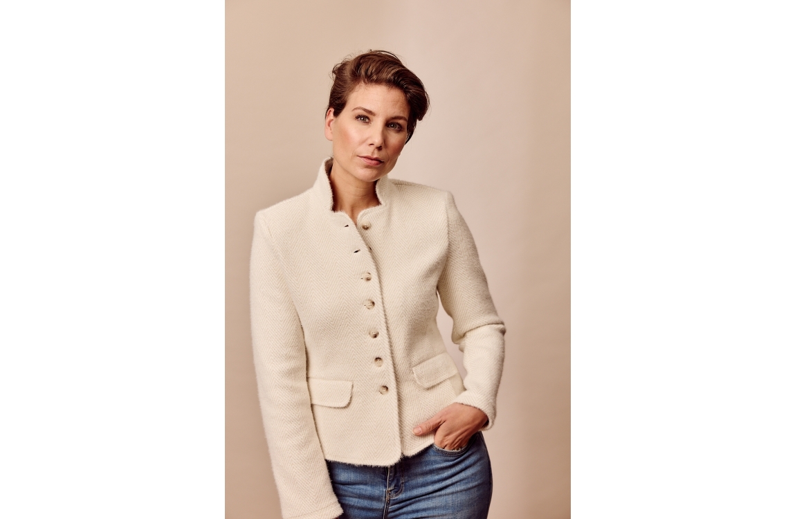 B-Three blazer Rachel. Dit licht getailleerde model is voorzien van een opstaande kraag en heeft lange mouwen. Deze off-white jasje van B-Three sluit door middel van knopen en beschikt over twee klepzakken. Dit model is bewerkt met een zigzag print uitgevoerd in een goudkleurige glitter.