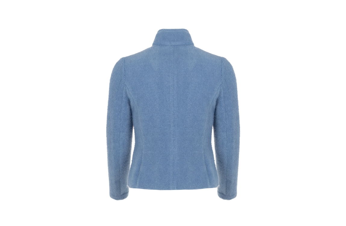 B-Three blazer Maartje 427. Deze licht getailleerde blazer heeft een opstaande kraag en lange mouwen. De lichtblauwe (sky) blazer van B-Three sluit aan de voorzijde met knopen en is voorzien van twee klepzakken. Het model heeft schoudervulling en is uitgevoerd in een stevige stof met structuur.
