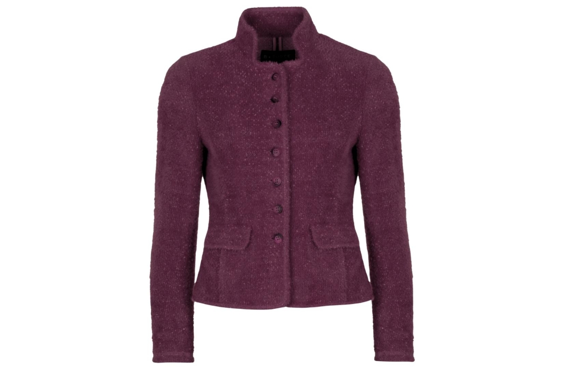 B-Three blazer Maartje 548. Dit licht getailleerde model heeft een opstaande kraag en lange mouwen. Deze paarse blazer van B-Three sluit aan de voorzijde met knopen en is voorzien van twee klepzakken. Het model heeft schoudervulling en is uitgevoerd in een stevige stof met structuur.